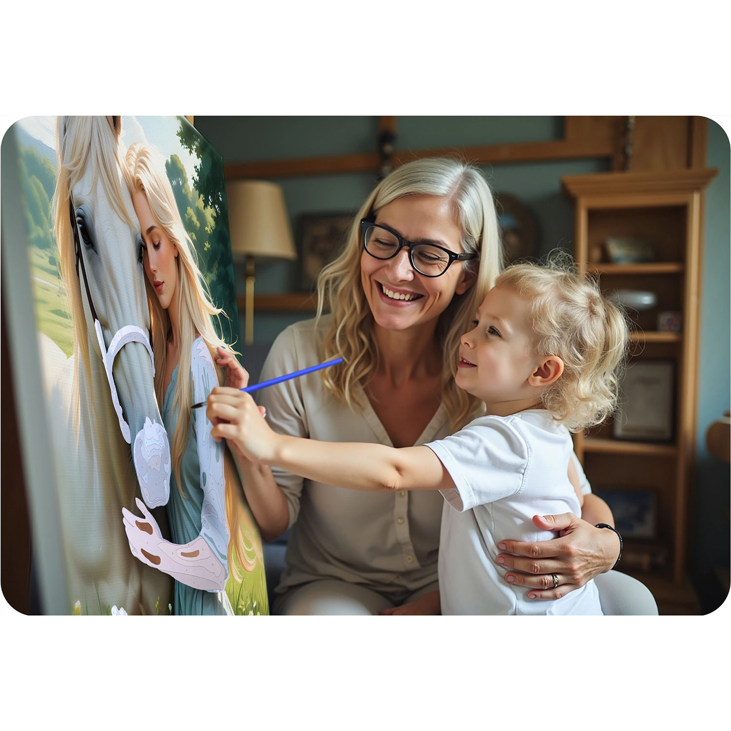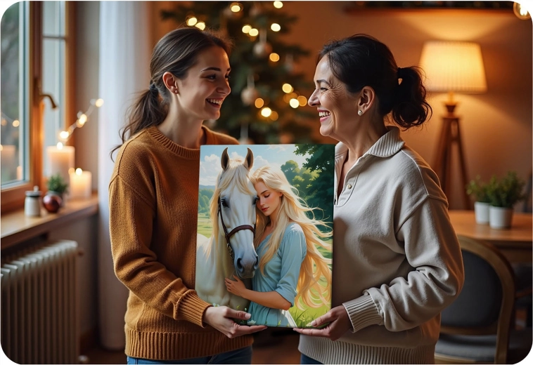 Het portret van de vrouw met het witte paard valt op door diepe tinten en een hoog detailniveau. Het voltooide werk wordt een opvallende decoratie voor uw interieur.