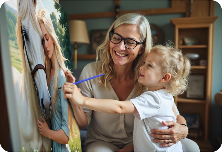 De set bevat 3 penselen in verschillende maten voor grote vlakken, details en fijne lijnen. 30 tinten acrylverf met goede dekking zorgen voor levendige, harmonieuze tonen van het motief van de vrouw en het paard. Het voltooide schilderij hangt u eenvoudig op met de meegeleverde haakjes – zo wordt het een stijlvolle decoratie voor de woonkamer, slaapkamer of kinderkamer.
