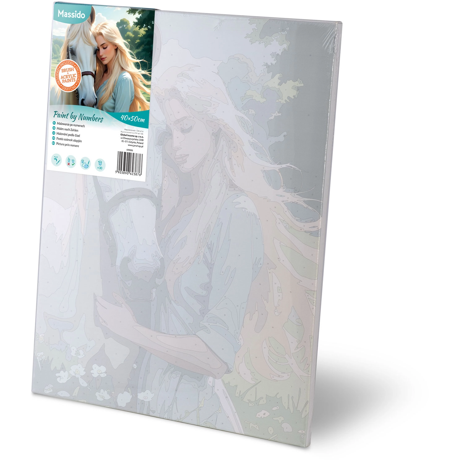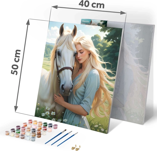 Ontdek de magie van creativiteit met de schilderen-op-nummer set 40×50 cm van het merk Massido. Het motief portret van een vrouw met een paard verrukt zowel beginners als gevorderden. In de set vindt u een voorgedrukt canvas op frame, 30 dekkende acrylverven, 3 penselen en haakjes om op te hangen. De gekleurde ondergrond en genummerde vlakken maken nauwkeurig inkleuren eenvoudig en garanderen een prachtig, intens resultaat.