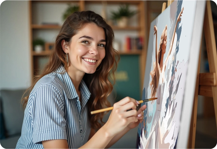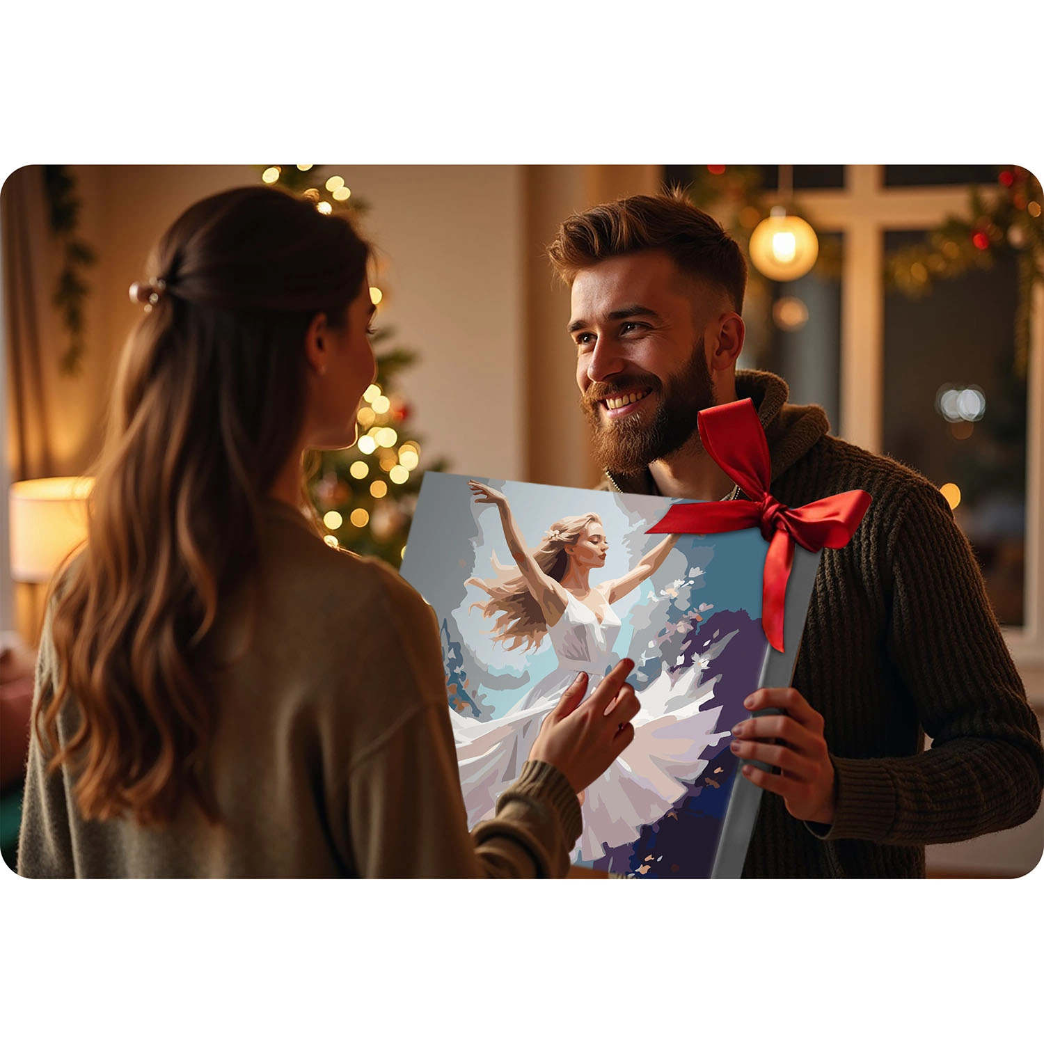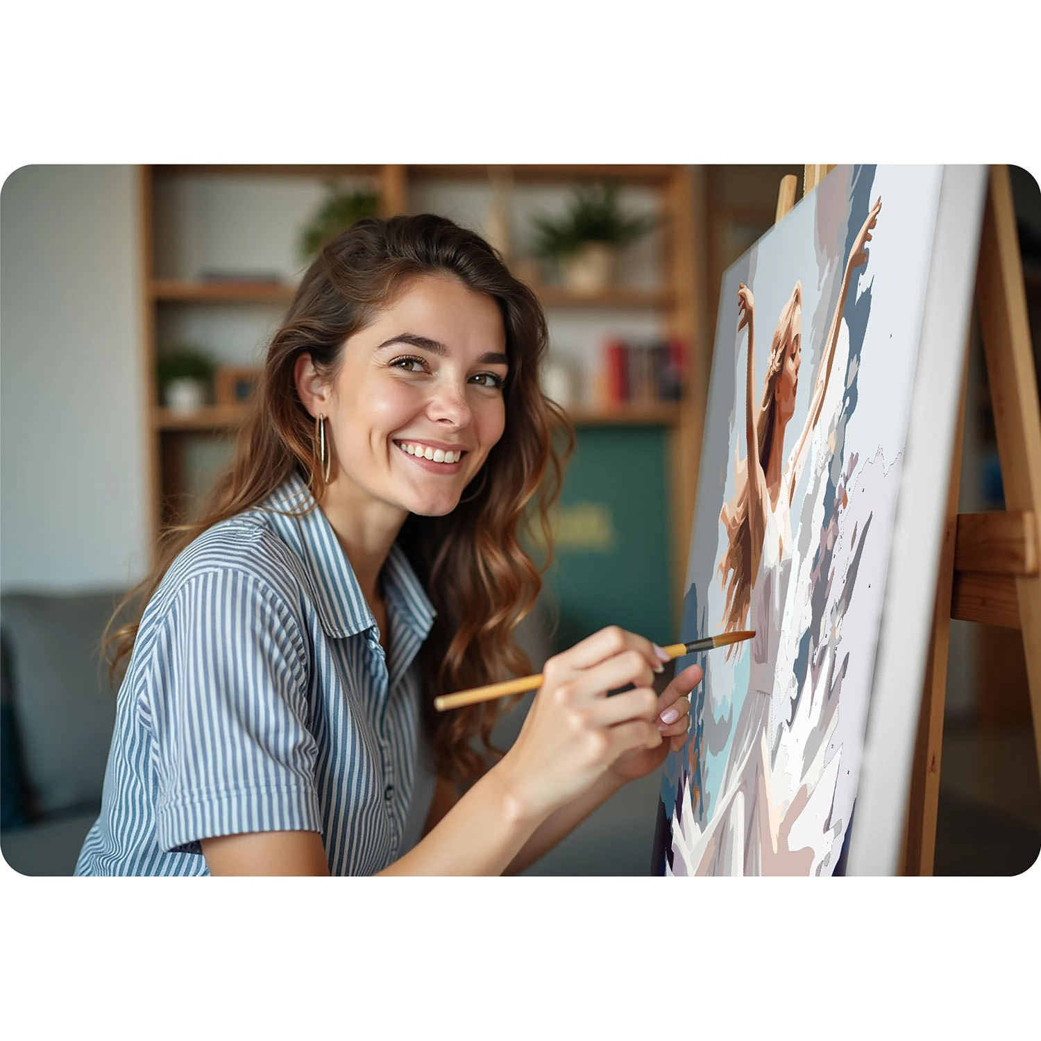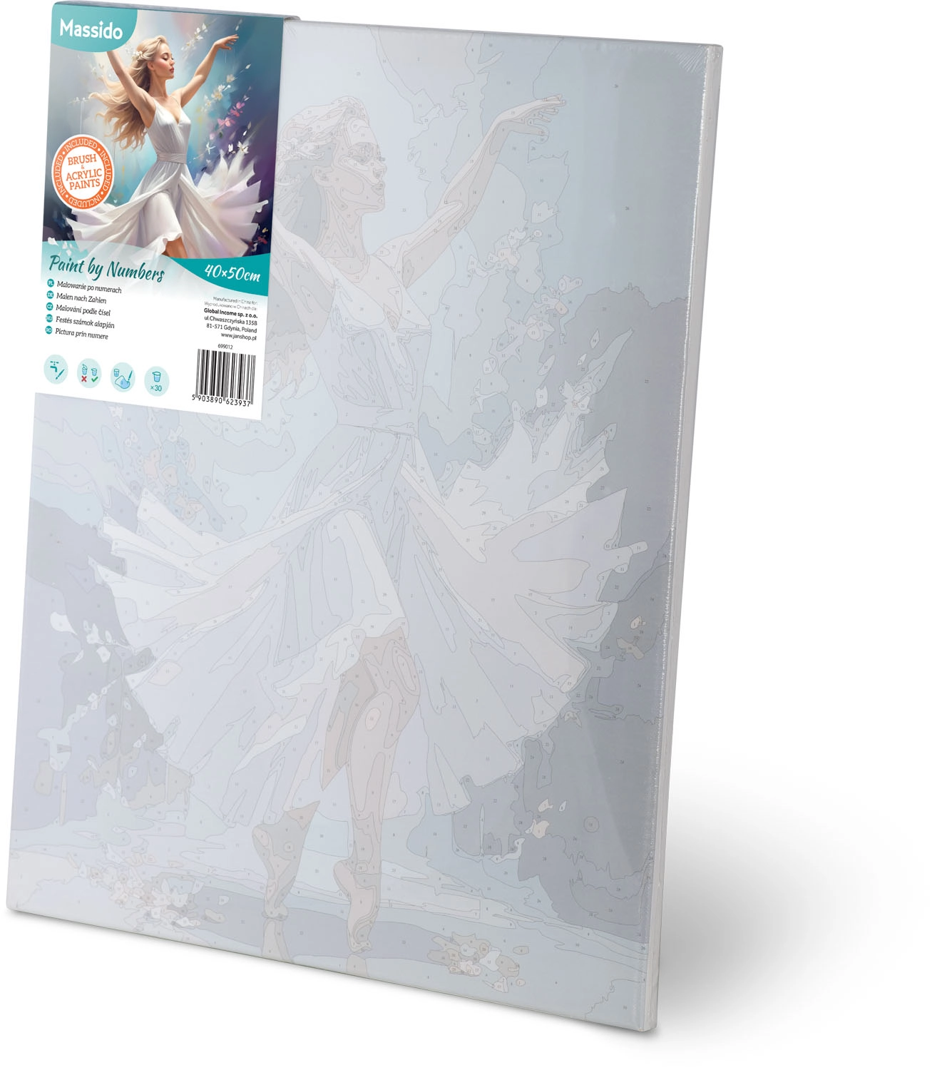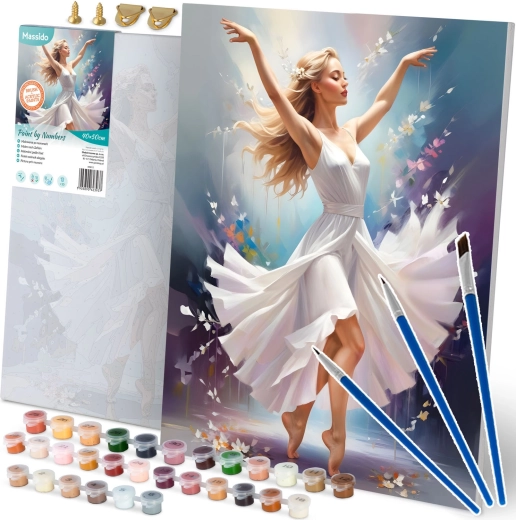 Verander je vrije tijd in een creatieve ervaring. De MASSIDO-set met het motief Dansende vrouw biedt alles wat je nodig hebt om een elegant schilderij te maken: een opgespannen canvas op frame met genummerde zones, maar liefst 30 intense acrylkleuren en drie precieze penselen. Dankzij de gekleurde ondergrond en duidelijke markeringen is schilderen intuïtief en ontspannend, ideaal voor kinderen en volwassenen.