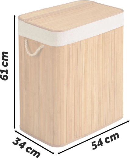Houd je huis opgeruimd met deze elegante bamboe wasmand van 100 l. Hij heeft 2 gescheiden compartimenten voor licht en donker wasgoed, een natuurlijke bamboeconstructie die bestand is tegen vocht en een uitneembare katoenen zak met koordsluiting voor eenvoudig transport naar de wasmachine.