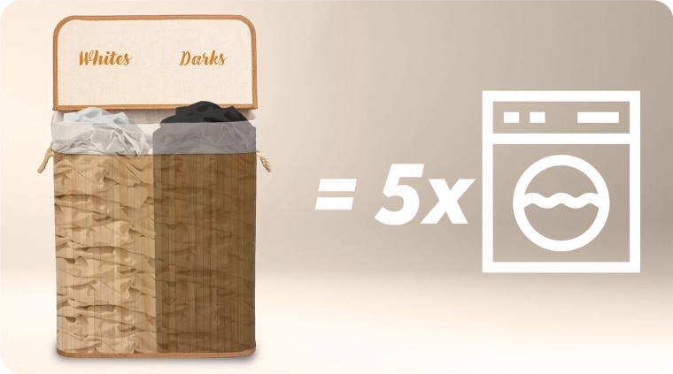 De tweekamerige wasmand van natuurlijke bamboe maakt dagelijks sorteren eenvoudiger – bij het inwerpen verdeel je het wasgoed direct in Lights en Darks. Dankzij het grote volume van 100 l past er wasgoed van meerdere wasbeurten in en blijven badkamer of slaapkamer overzichtelijk en schoon.