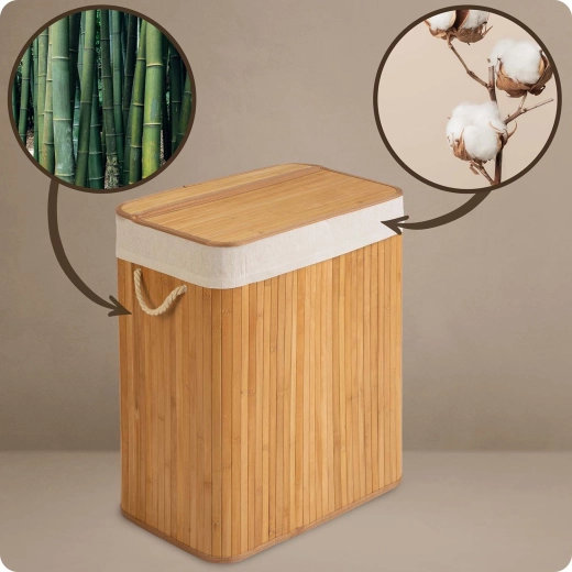 Natuurlijke materialen – bamboe en katoen – bevorderen de ventilatie en helpen vocht en geurtjes te beperken. De uitneembare katoenen zak trek je er gemakkelijk uit, sluit je met het koord en neem je zo mee naar de wasmachine. Een praktisch deksel, stevige touwgrepen en een stabiele bodem zorgen voor een lange levensduur en eenvoudig gebruik.