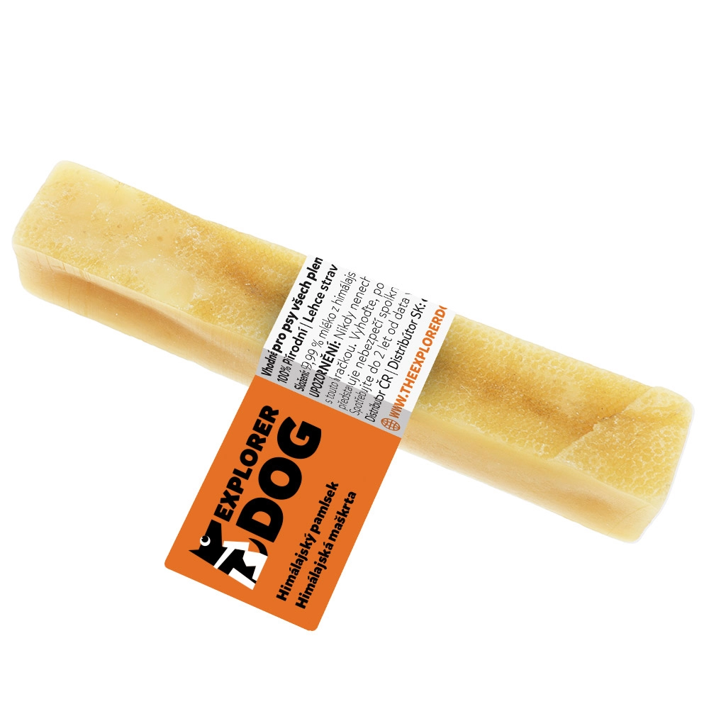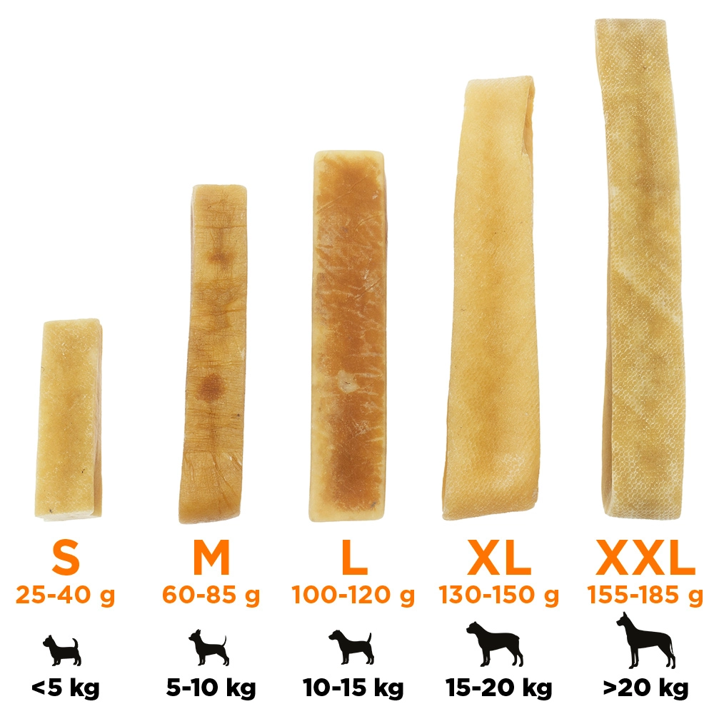 De dichte, gedroogde kaasstick zorgt voor lang kauwen, wat vermaakt en tegelijk gezonde gewoonten ondersteunt.