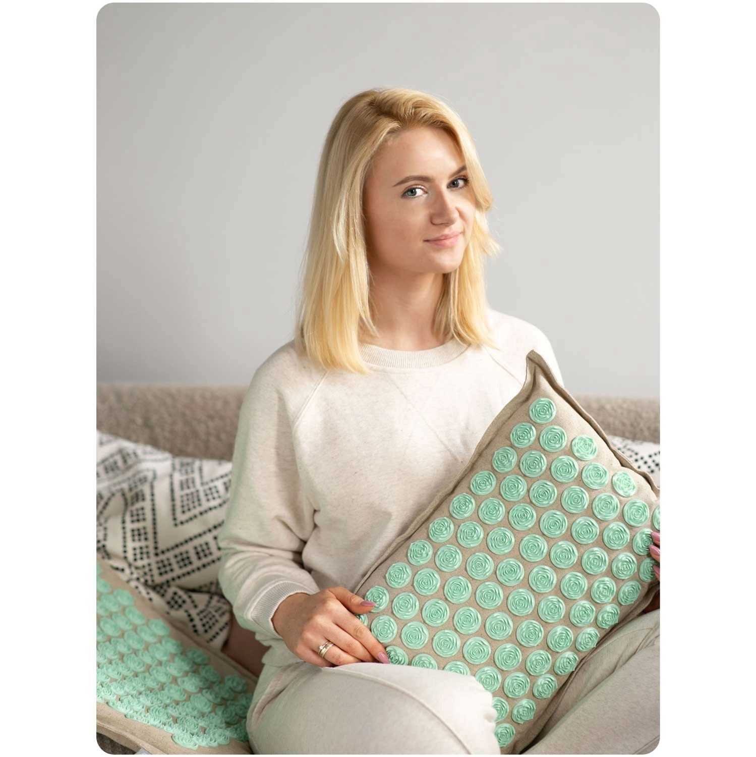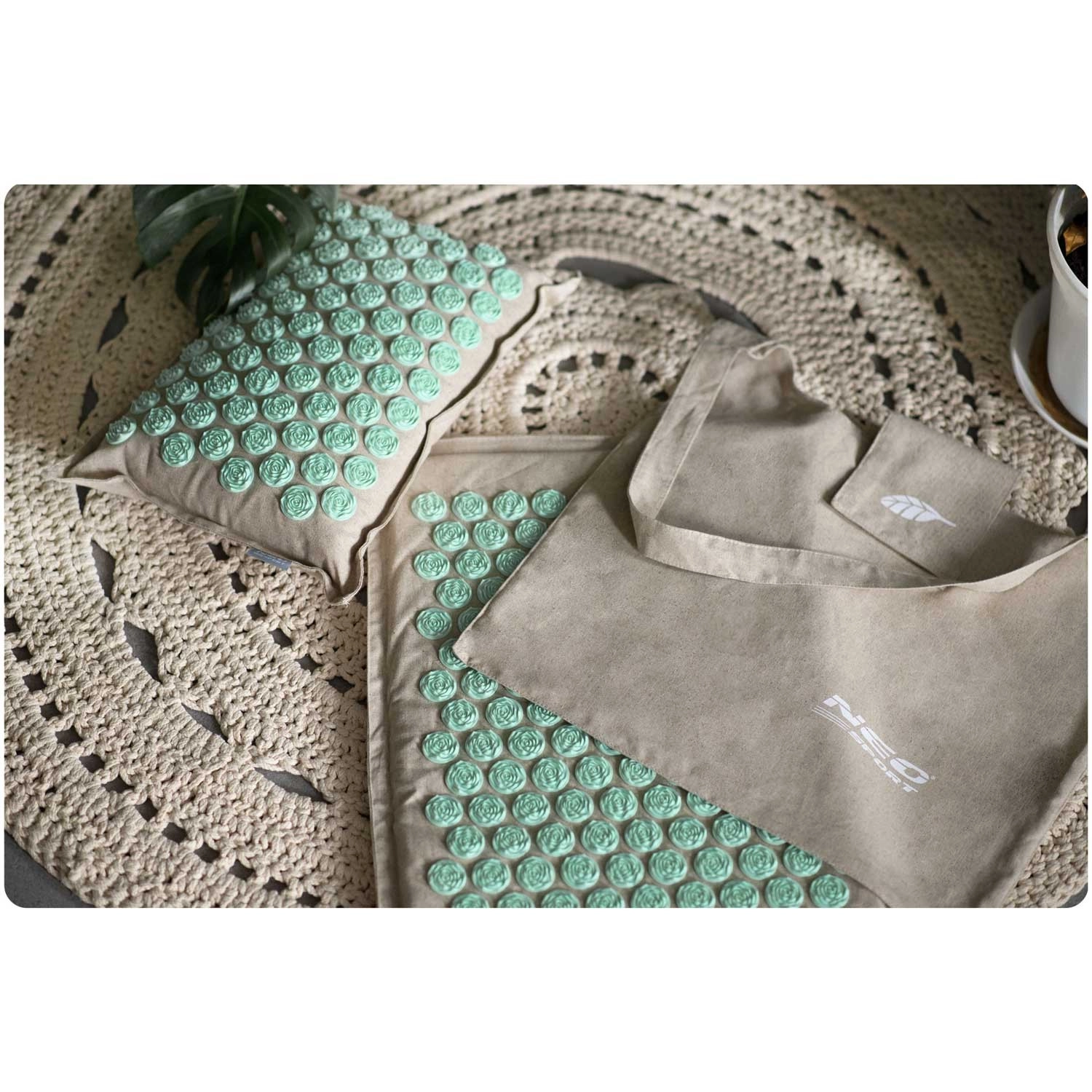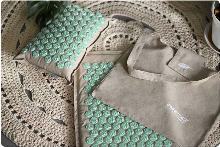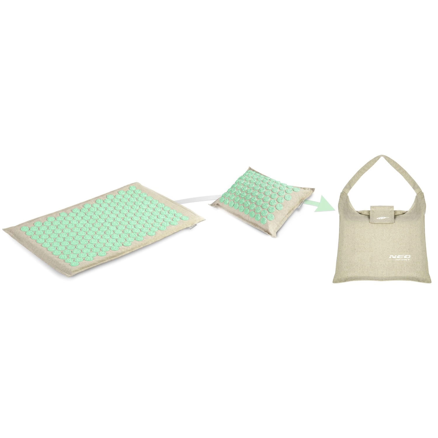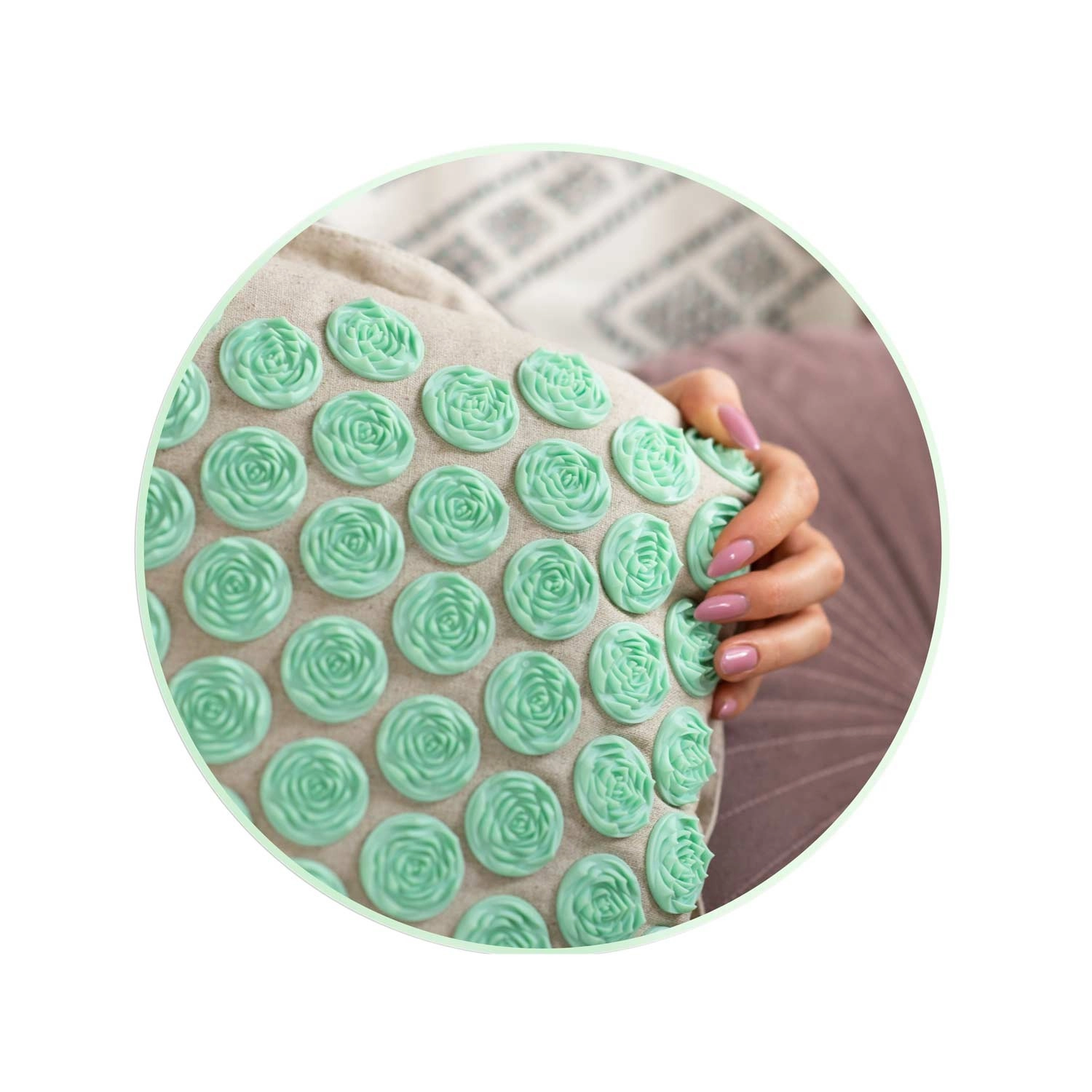 Op de mat bevinden zich 181 en op het kussen 76 rozetten met fijne puntjes die drukpunten stimuleren, de doorbloeding bevorderen en spierspanning verminderen voor snellere recuperatie.