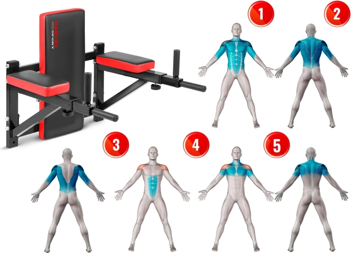 Verander je kamer in een homegym met het wandstation NEO SPORT NS-320. Biedt multifunctionele training 5-in-1 voor buik, rug, schouders en borst, comfortabele bekleding en antislipgrepen voor zekerheid en comfort. Dankzij de stevige stalen constructie en de eenvoudige montage met de meegeleverde set keilbouten krijg je stabiele en veilige uitrusting voor effectieve training met eigen lichaamsgewicht.