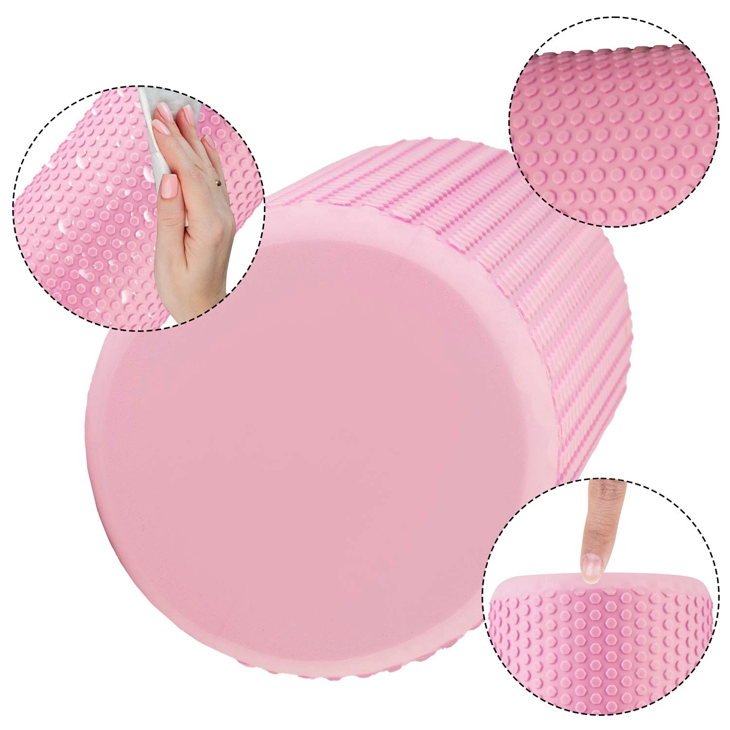 De roze massagefoamroller van EVA-schuim is ontworpen voor effectieve zelfmassage en myofasciale release na een training of een drukke dag. De stevige maar aangenaam harde constructie helpt de flexibiliteit te verbeteren, spierspanning te verminderen en het herstel te versnellen. Dankzij de antisliptextuur met punten blijft hij stabiel op zijn plaats en biedt hij gerichte druk op de spieren.