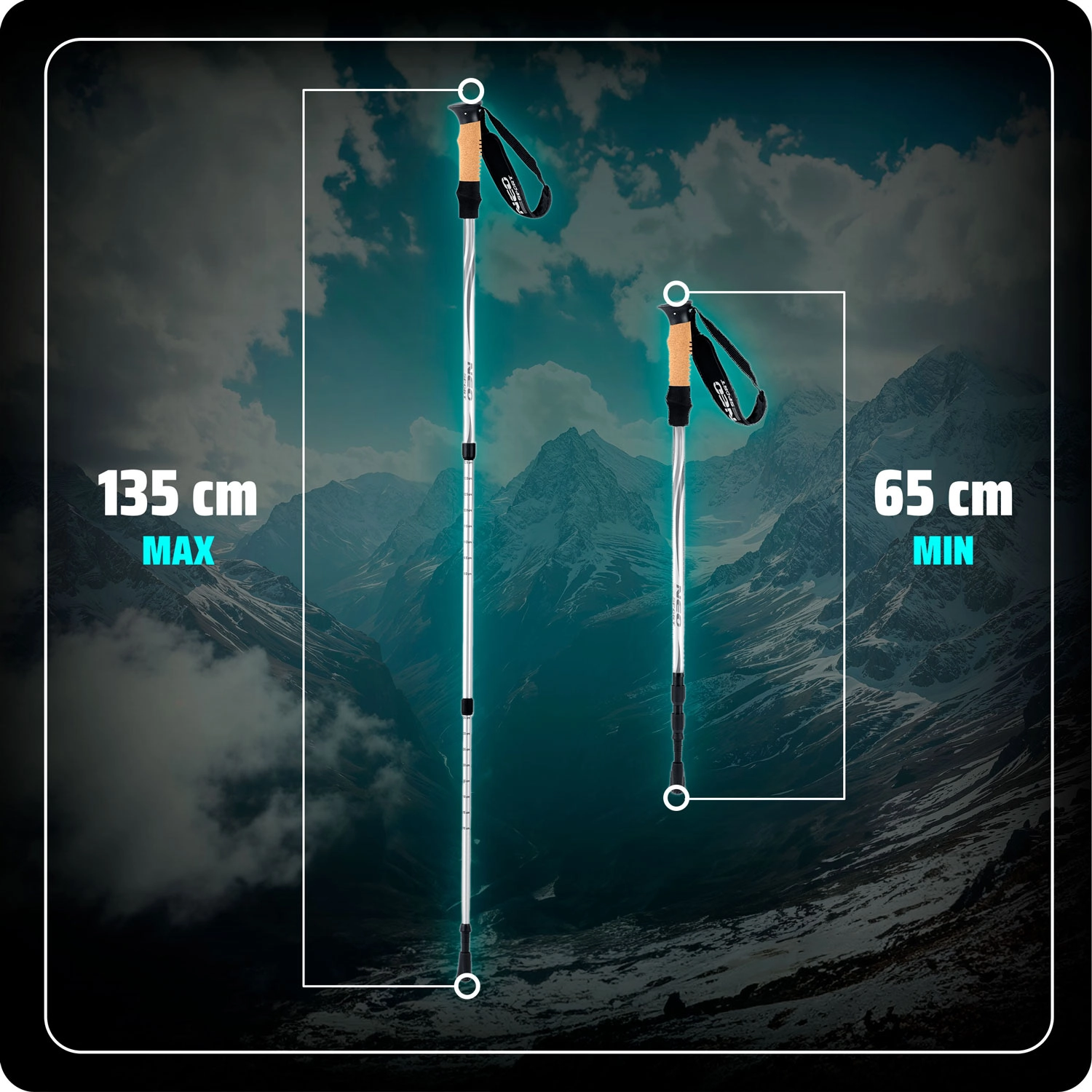 Meersegment aluminium buizen met schaalverdeling maken snelle en nauwkeurige afstelling mogelijk voor verschillende lengtes en hellingen. Compact opgevouwen – eenvoudig aan de rugzak te bevestigen.