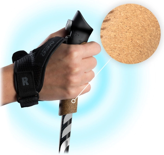 Ademend kurk houdt de handpalmen droog en op een aangename temperatuur. De verstelbare handschoen van zachte, ventilerende stof biedt stevige geleiding van de stokken zonder overmatig knijpen – met de mogelijkheid tot eenvoudig losklikken met één druk.