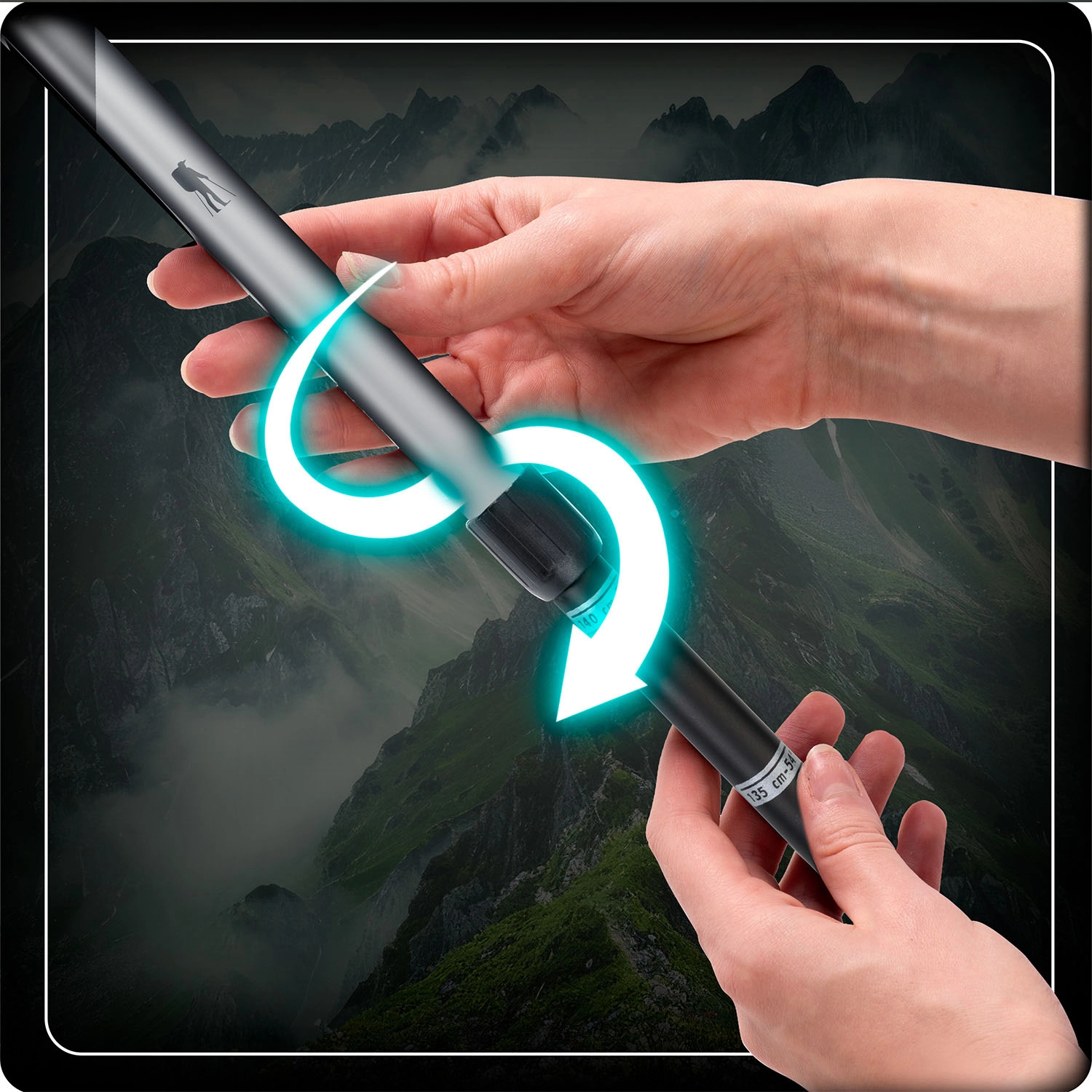 De telescoopconstructie met duidelijk meetschaal maakt snelle aanpassing aan de gebruikerslengte en het routeprofiel mogelijk. In ingeschoven toestand bevestigt u ze eenvoudig aan de buitenkant van de rugzak.