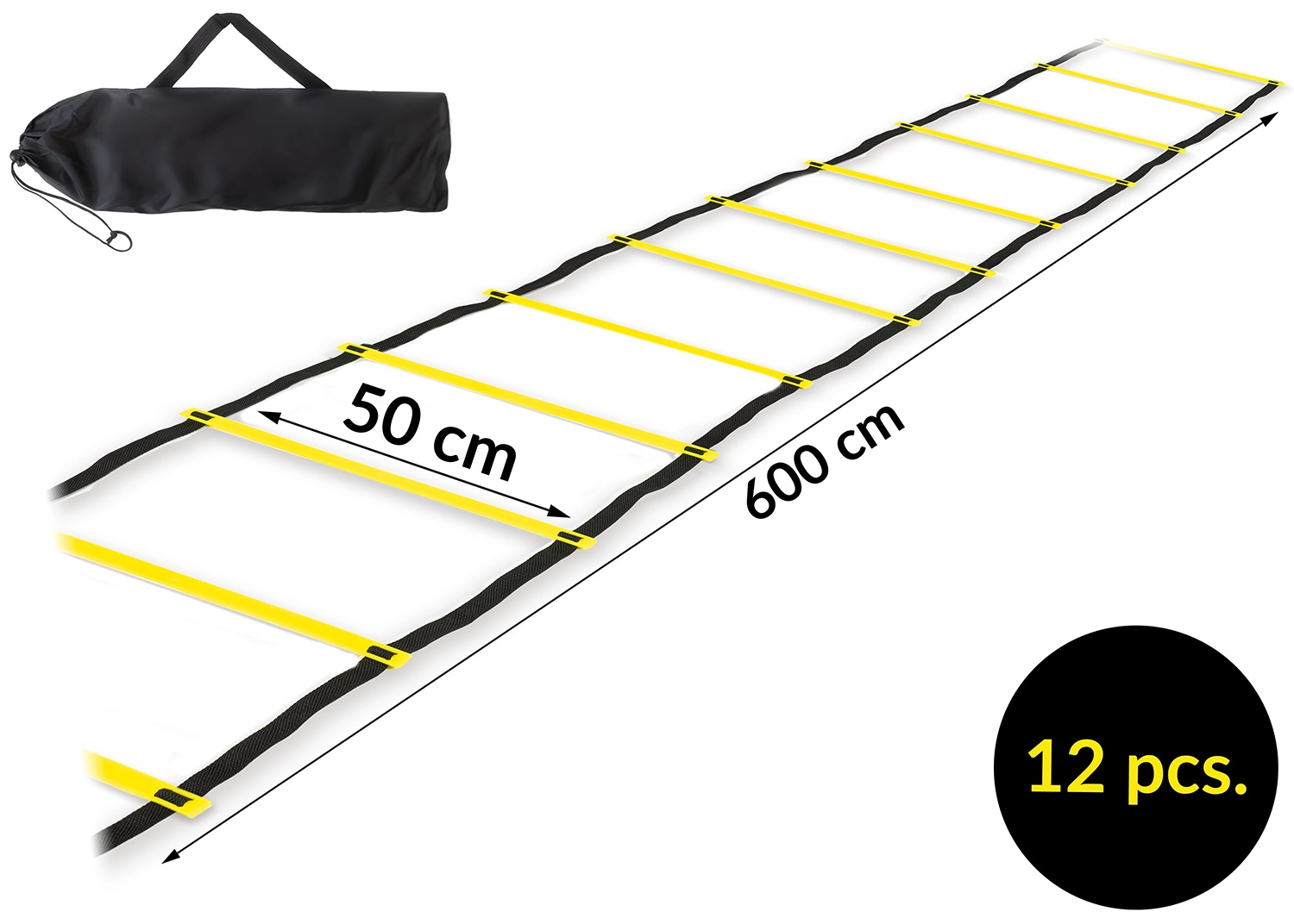 Zeer duurzame coördinatieladder met 12 verschuifbare sporten en een lengte tot 6 m, ideaal voor training van snelheid, agility en coördinatie. Het lichte ontwerp van slijtvast PVC en PE-banden maakt eenvoudig transport mogelijk, en de verstelbare afstand tussen de sporten past de moeilijkheidsgraad van de training aan. Inclusief praktische draagtas met handlus, gratis.