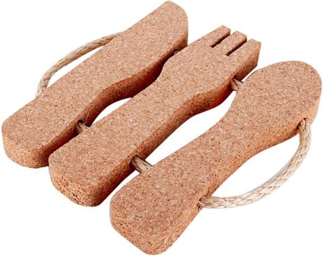 Deze decoratieve onderzetter van natuurlijke kurk is ontworpen in de vorm van bestek, wat hem tot een origineel accessoire maakt voor elke keuken of eetkamer. Hij biedt betrouwbare bescherming van oppervlakken tegen hete pannen en schalen en geeft de gedekte tafel tegelijk een unieke uitstraling.