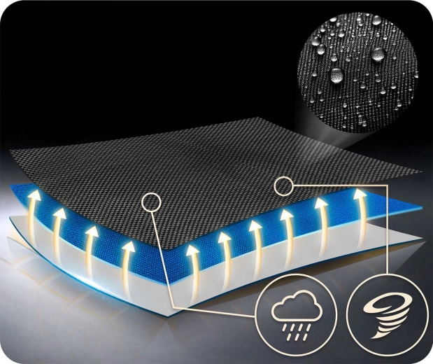 De sterke stof weerstaat regen en intensief gebruik, behoudt vorm en kleur en is in een handomdraai schoon te maken.