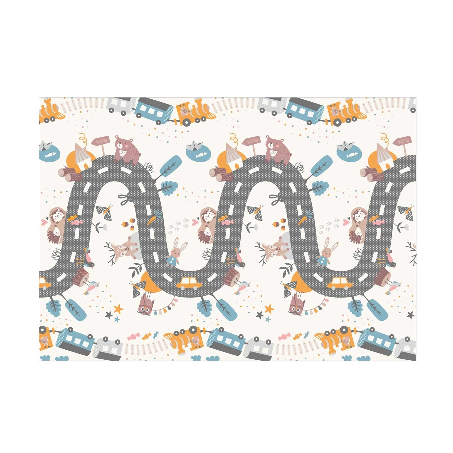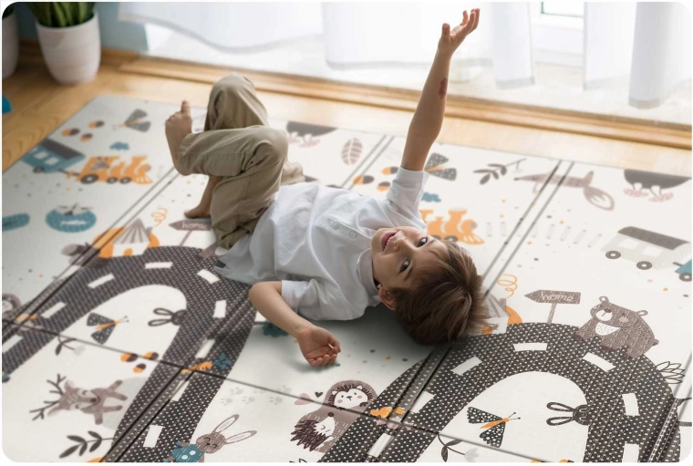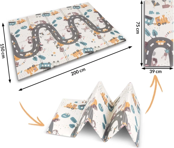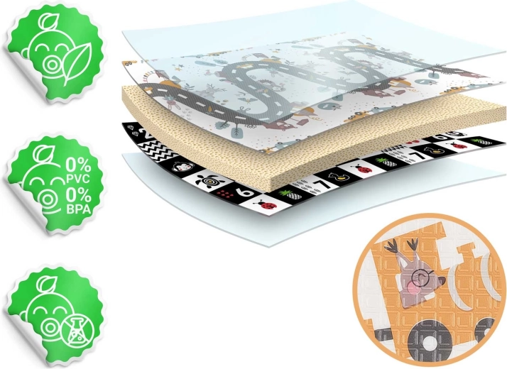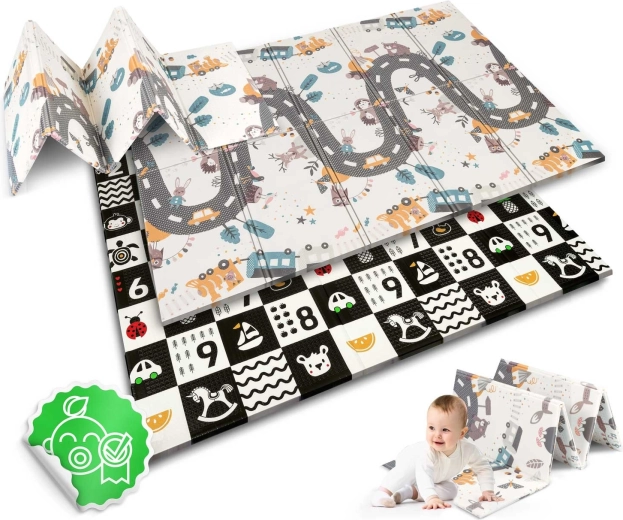 Praktische en stijlvolle kinder-speelmat van hoogwaardig XPE-schuim met afmetingen 200 × 150 × 1 cm biedt een zachte en veilige omgeving om te spelen, kruipen en de eerste stapjes te zetten. De mat is dubbelzijdig (educatieve contrasterende zijde en een speelse weg met dieren), opvouwbaar, licht, waterafstotend en makkelijk schoon te maken. Dankzij de antislipstructuur, thermische isolatie vanaf de vloer en de samenstelling zonder BPA, PVC, ftalaten en formamide voldoet zij aan strenge Europese normen en biedt zij kinderen premium comfort en veiligheid.
