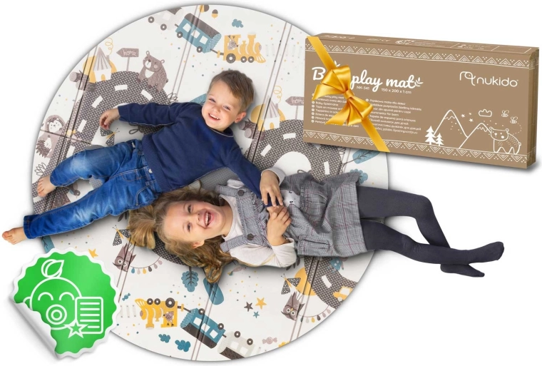 Deze grote opvouwbare NUKIDO-schuimmat blinkt uit met een dikte van 1 cm voor betrouwbare schokdemping bij valpartijen op harde vloeren en thermische isolatie tegen koude tegels of laminaat. Het dubbelzijdige dessin prikkelt zintuigen en verbeelding: één zijde biedt hoog contrast met cijfers en iconen voor vroeg leren, de andere zijde een wegthema voor spel met autootjes en verhalen.