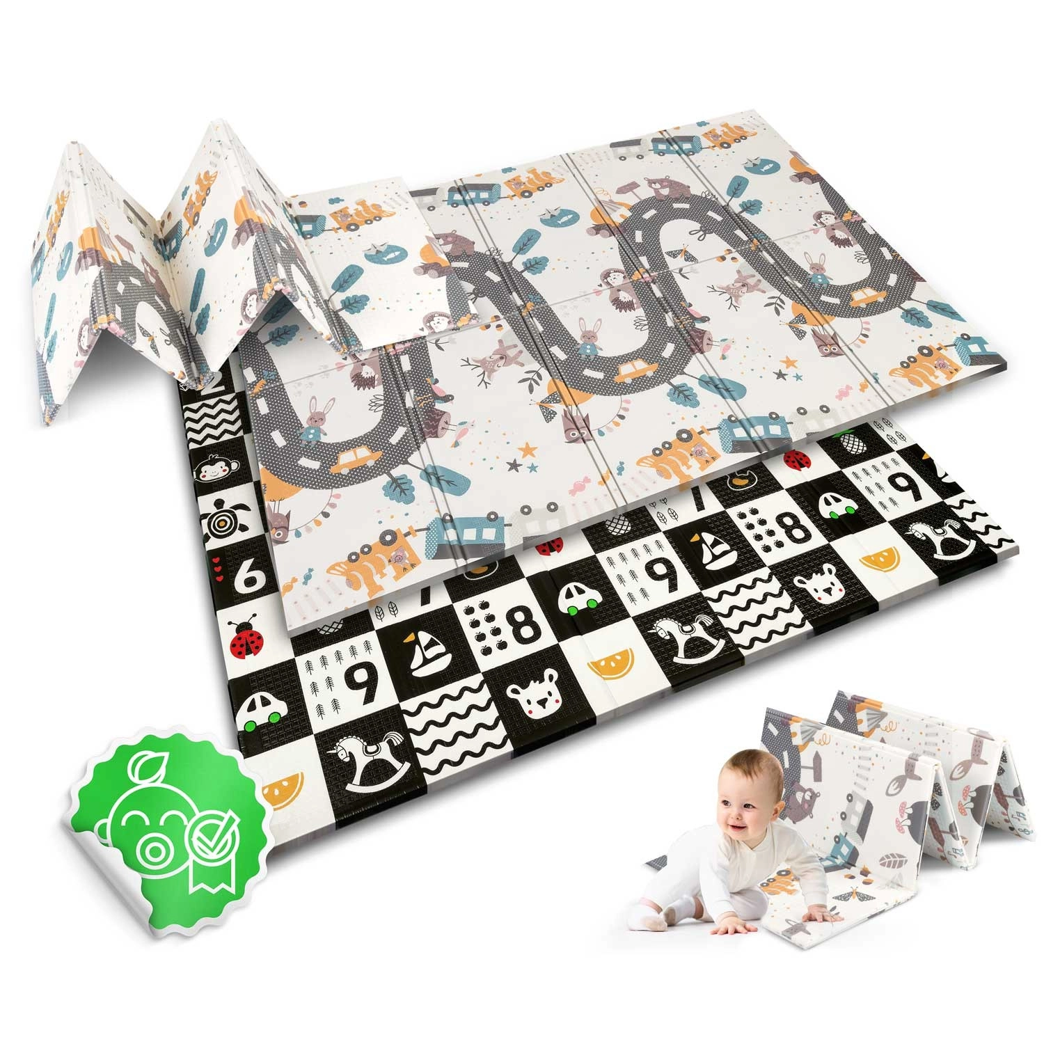 Hoog-contrast zijde met cijfers en iconen voor vroeg leren en visuele stimulatie; de andere zijde met een weg en dieren voor creatieve spelletjes met autootjes.