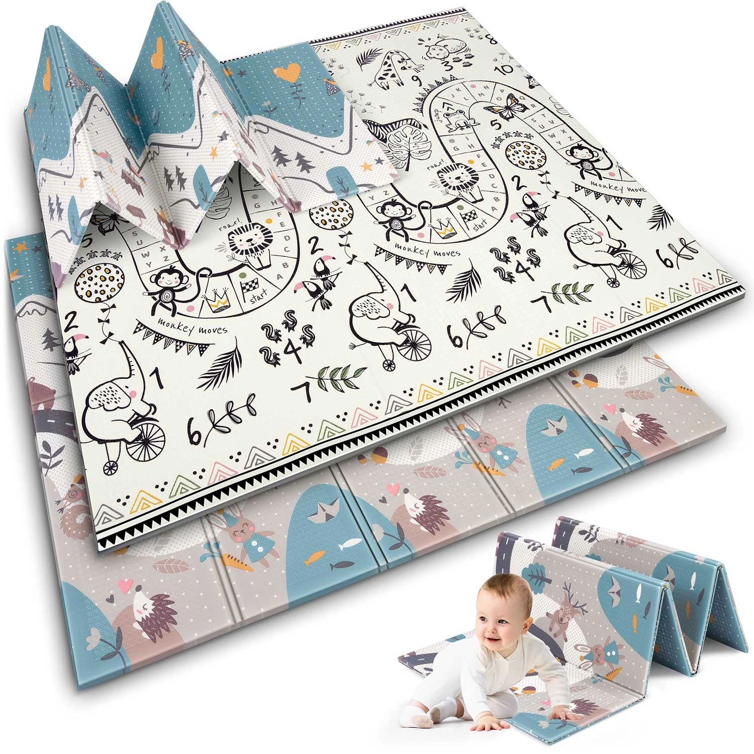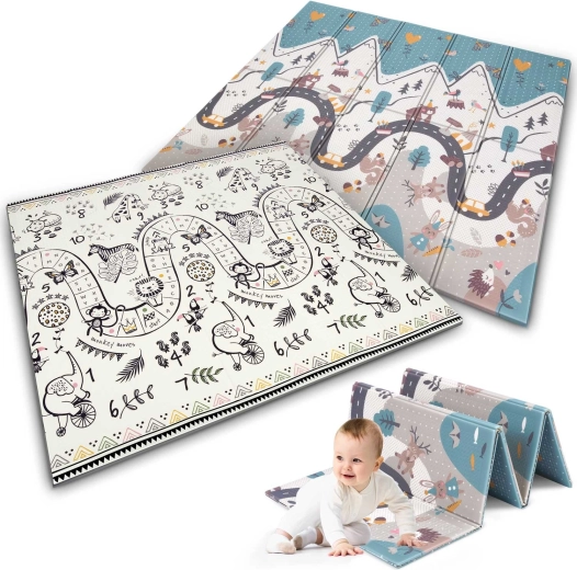 Ontdek een praktische en stijlvolle speelruimte voor baby’s en kleuters. Het dubbelzijdige ontwerp met educatieve motieven nodigt uit om cijfers, dieren en vormen te ontdekken, terwijl het zachte XPE-schuim vertrouwen geeft bij de eerste kruip- en looppogingen. De mat vouwt in accordeonstijl, zodat je haar snel kunt meenemen, in de auto kunt leggen of onder het bed kunt schuiven.
