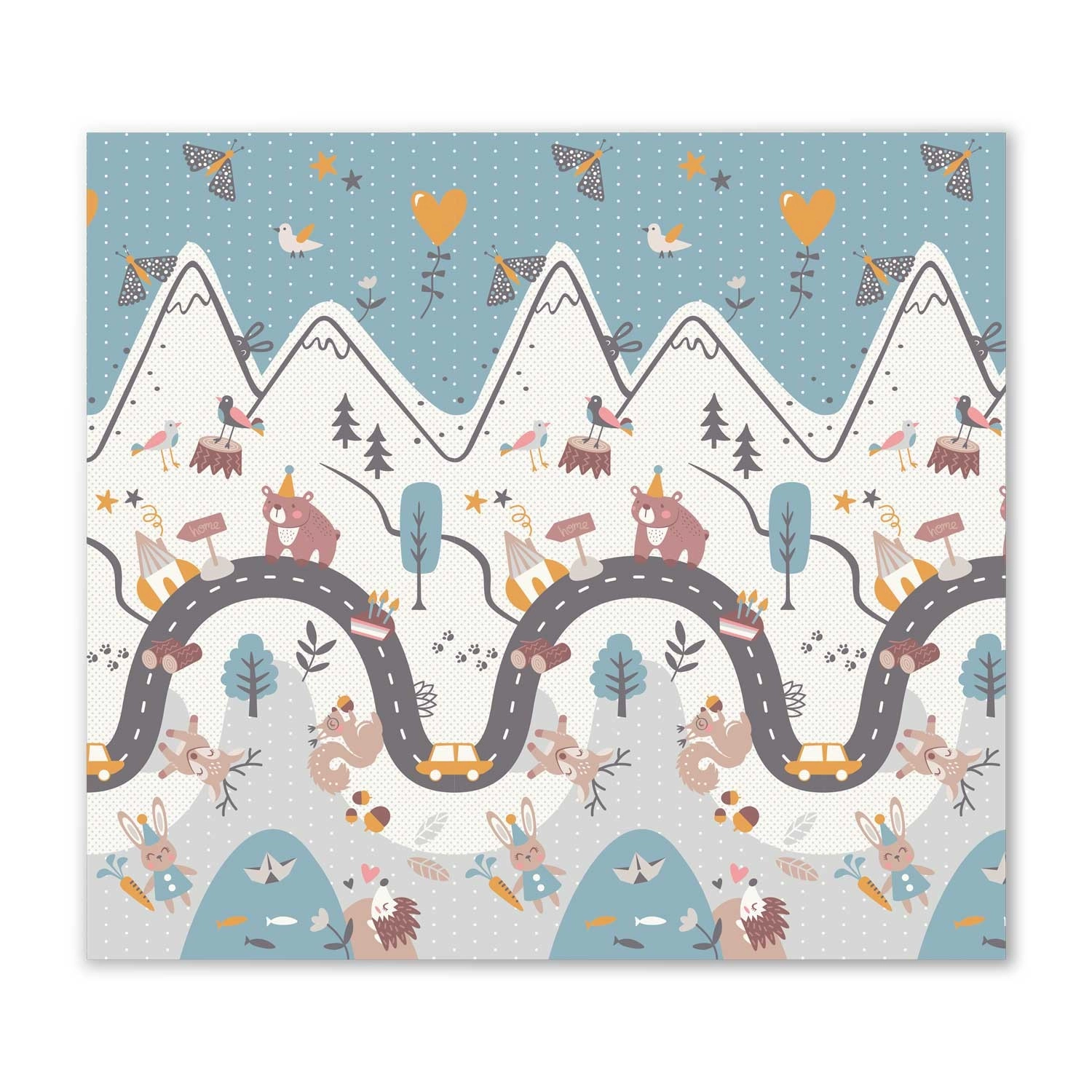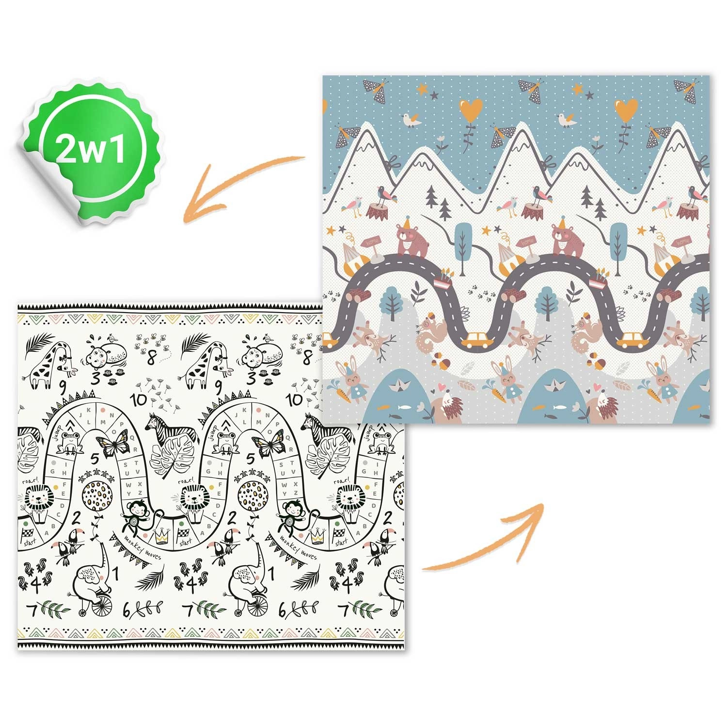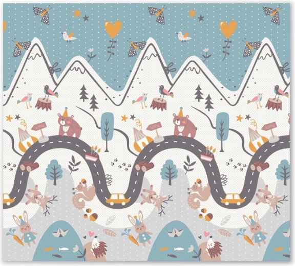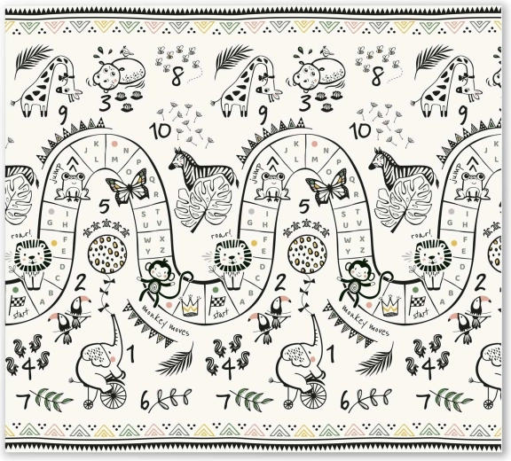 Eén zijde met een kleurrijke bergroute, de andere met contrasterende cijfers en diertjes voor speels leren. Draai de mat simpelweg om en verander de sfeer in de speelhoek.