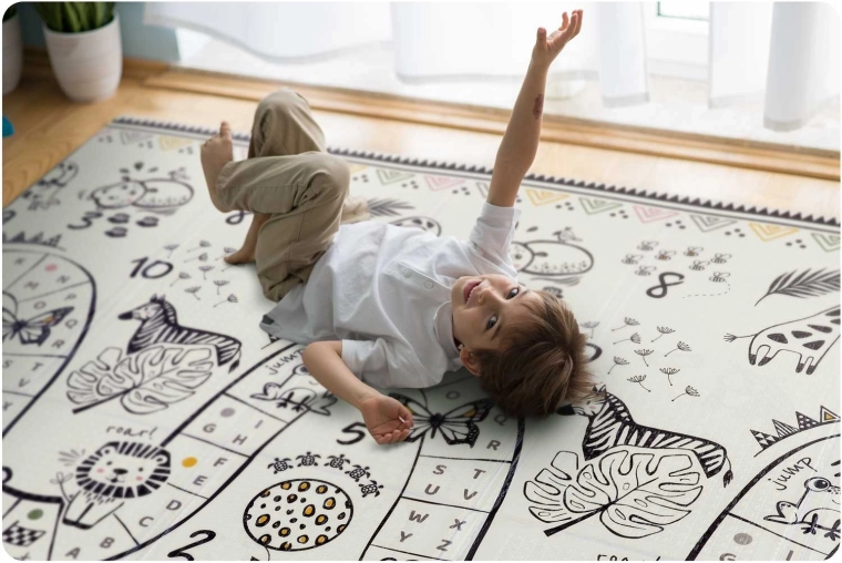 Dankzij het waterdichte oppervlak maak je haar in een oogwenk schoon met een vochtige doek. De dikte van 1 cm biedt betrouwbare demping op harde ondergronden zoals tegels of parket en zorgt voor aangename warmte tijdens het spelen. De mat glijdt niet, scheurt niet en is ook geschikt voor kinderen met allergieën – ze houdt geen stof of huisstofmijt vast.