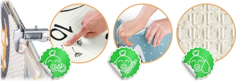 De dikte van 1 cm dempt vallen en beschermt op harde vloeren. Het materiaal is niet-toxisch, reukloos en voldoet aan strenge Europese normen.