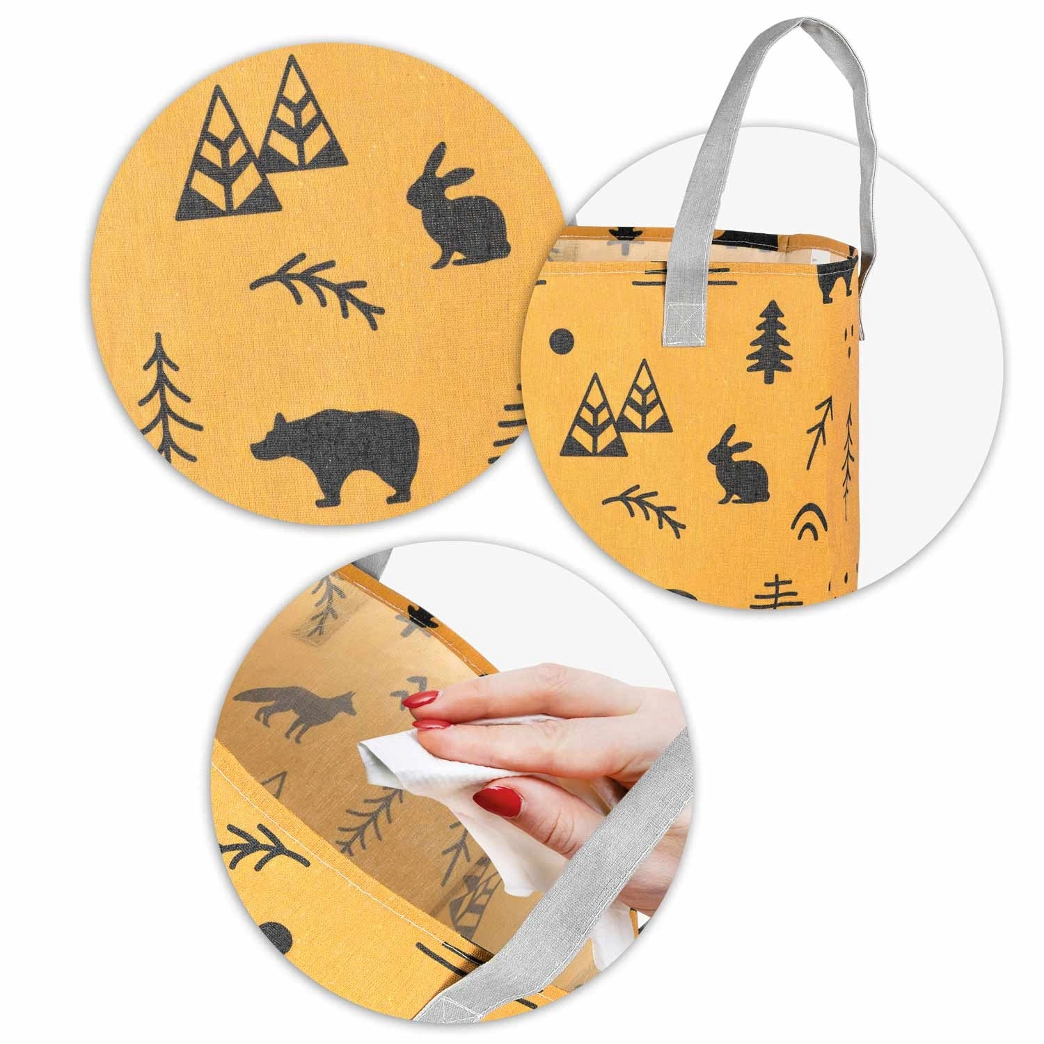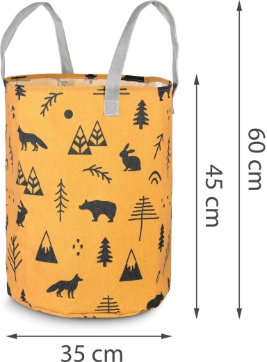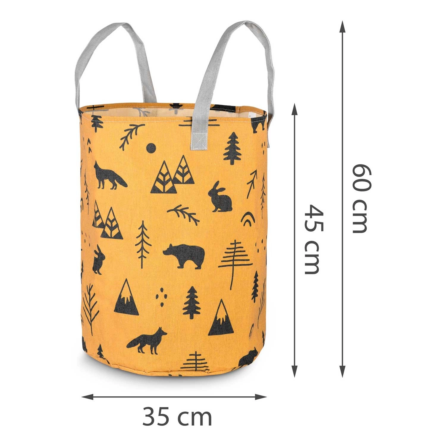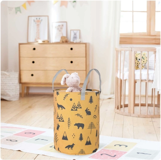 Maak van opruimen een plezier. De textiele NUKIDO-speelgoedmand met gele print met bosmotieven is ontworpen om functioneel, duurzaam en esthetisch te zijn. Dankzij de hoge cilindrische vorm en open bovenzijde leg je er eenvoudig knuffels, blokken en kleinigheden in – en haal je ze er zo weer uit.