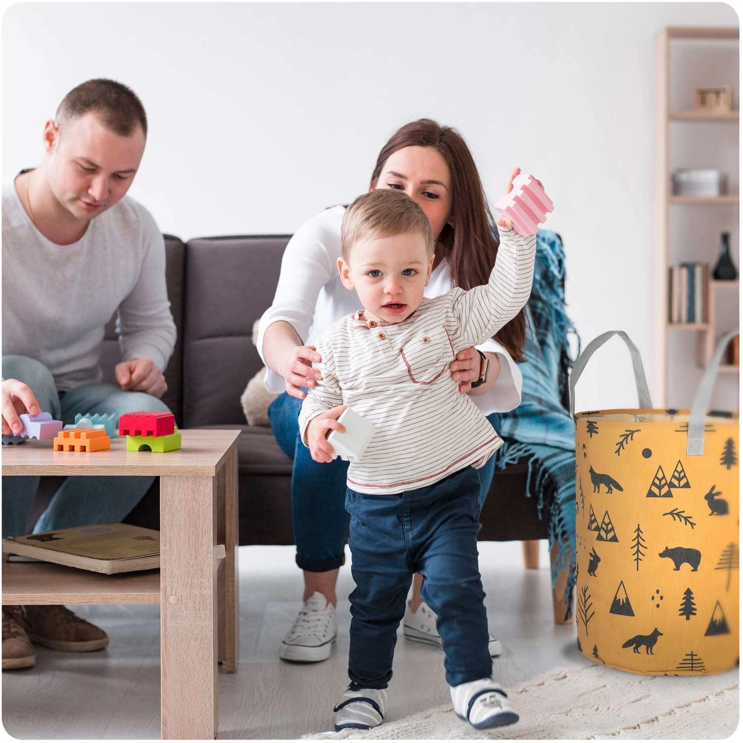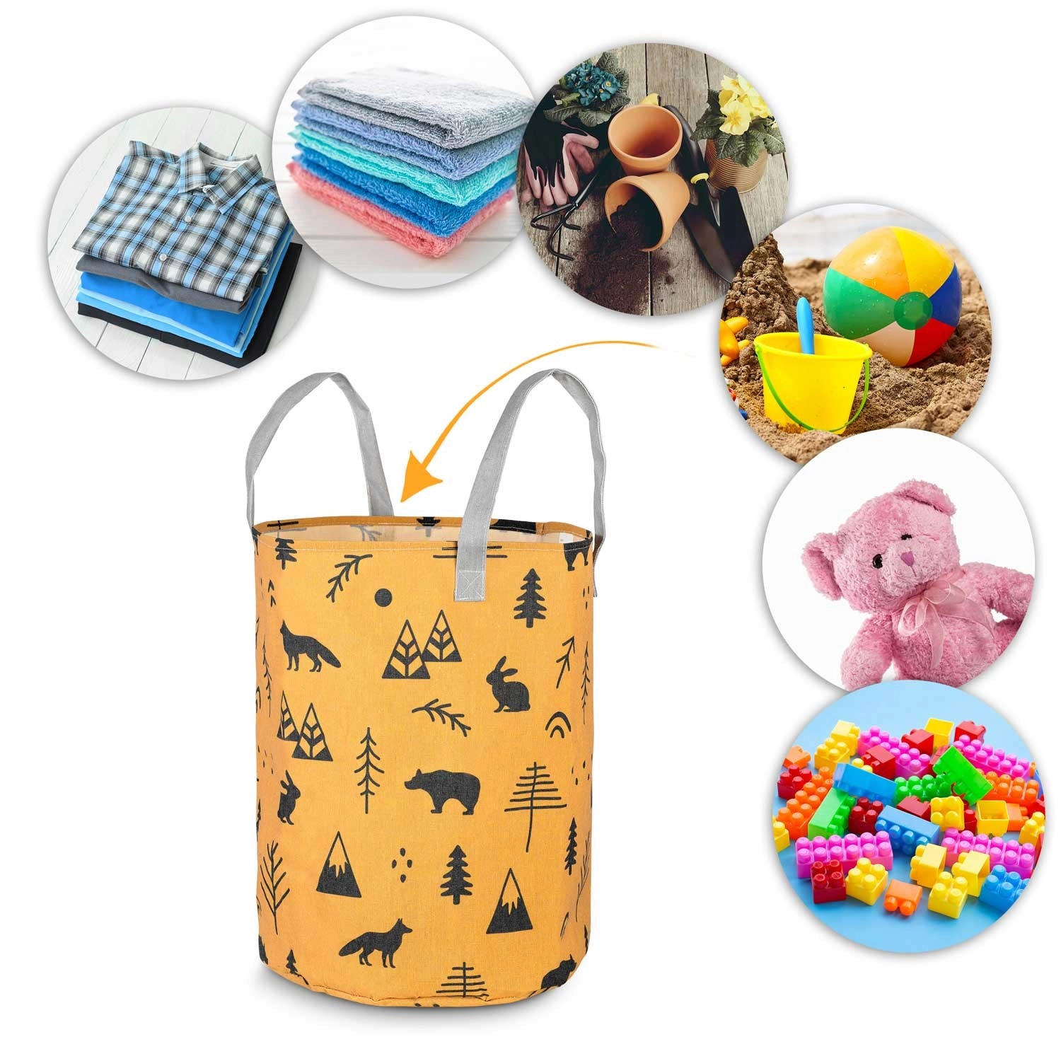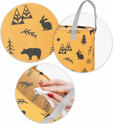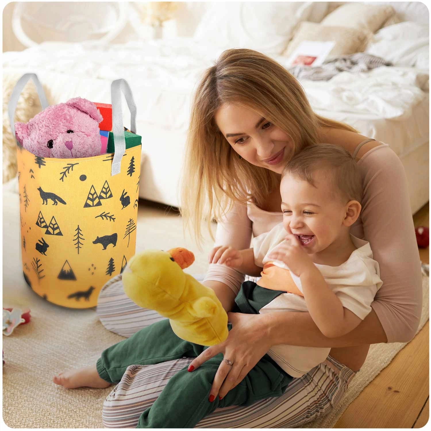 Maak van opruimen een plezier. De textiele NUKIDO-speelgoedmand met gele print met bosmotieven is ontworpen om functioneel, duurzaam en esthetisch te zijn. Dankzij de hoge cilindrische vorm en open bovenzijde leg je er eenvoudig knuffels, blokken en kleinigheden in – en haal je ze er zo weer uit.