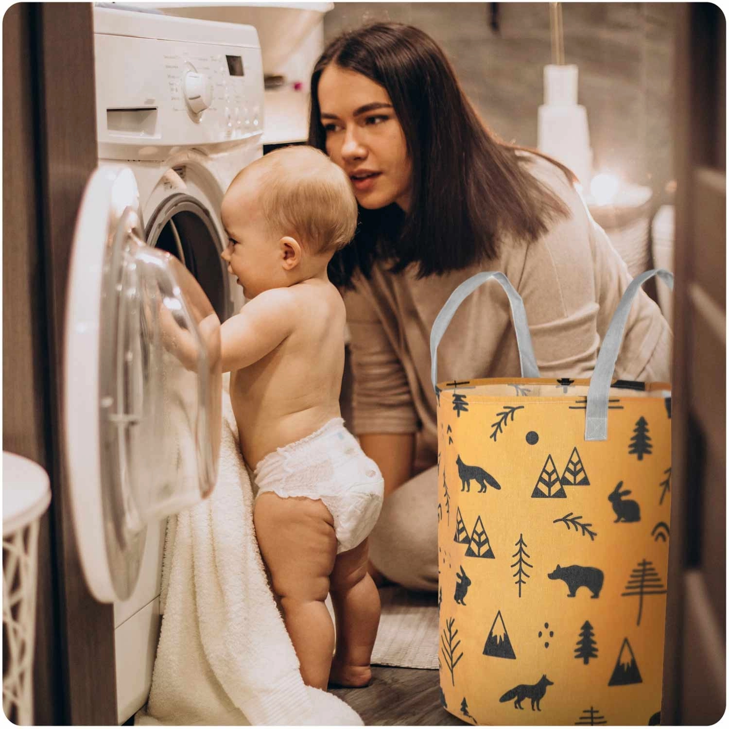 De mand is licht en draagbaar dankzij de stevige handgrepen, maar behoudt toch zijn vorm en staat zelfstandig. Past in de kinderkamer, badkamer en woonkamer – te gebruiken voor speelgoed, was, dekens of accessoires. Het oppervlak is makkelijk te onderhouden en de print geeft de ruimte een knusse, speelse uitstraling.