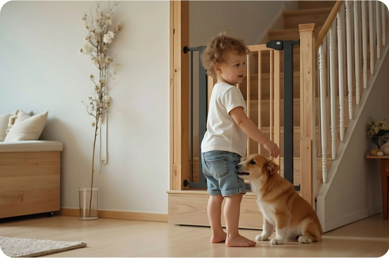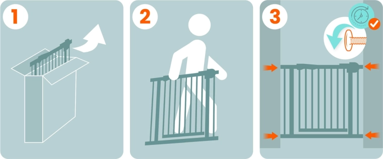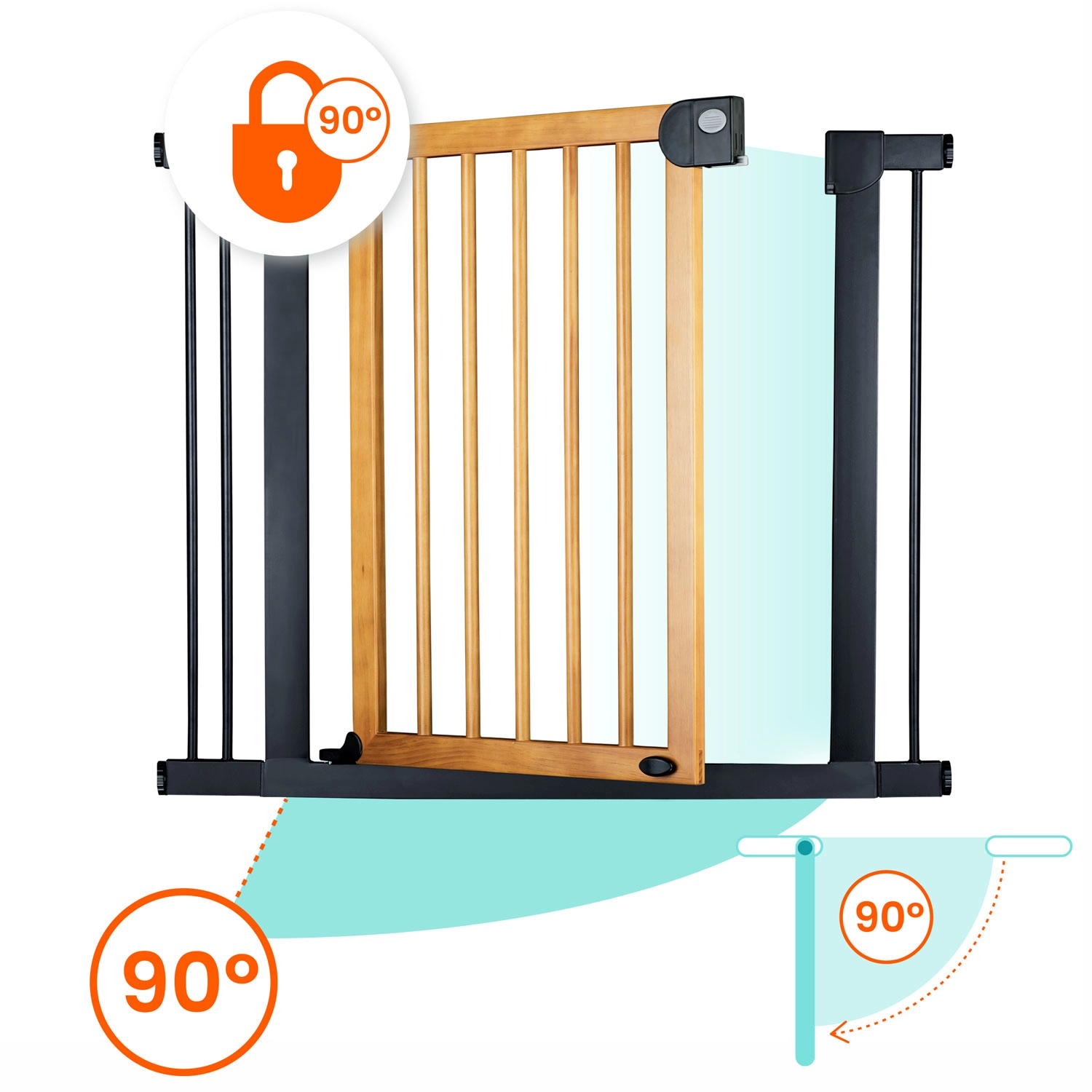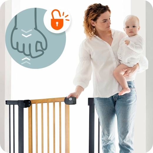 Het doordachte mechanisme met dubbele vergrendeling is voor een kind niet te openen, terwijl een volwassene het comfortabel met één hand kan bedienen. Het hek opent naar beide kanten en kan op 90° worden vastgezet voor onbelemmerde doorgang. Een stille sluiting en eenvoudig dichtdoen verhogen het dagelijks gebruikscomfort.