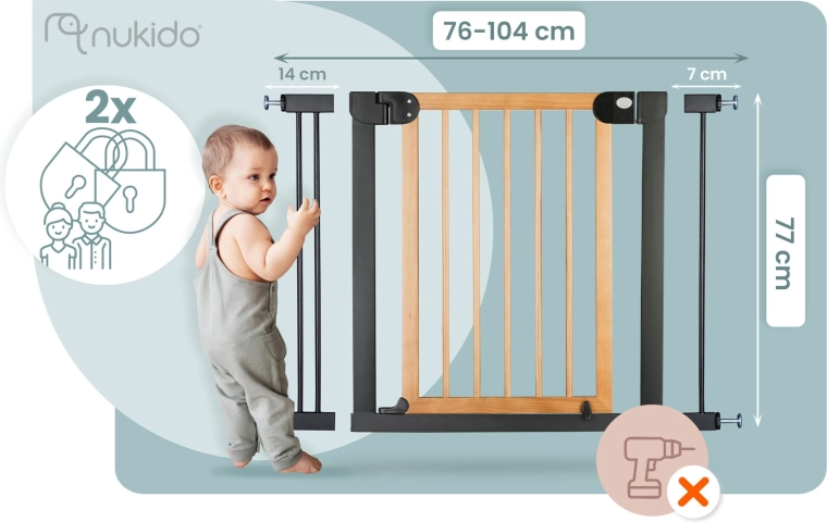 Universeel NUKIDO-veiligheidshek met klembevestiging zonder boren beschermt kinderen en huisdieren. Biedt traploze breedte-instelling van 76–104 cm, hoogte 77 cm, éénhandsbediening en tweedelig openen met de mogelijkheid van vergrendeling op 90°. De stijlvolle zwart-houten combinatie past bij zowel een modern als natuurlijk interieur.
