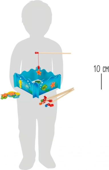 Kinderen vangen kleurrijke visjes en zeepaardjes met houten hengels met een magneet. Eenvoudig principe, veel plezier en training van de fijne motoriek.