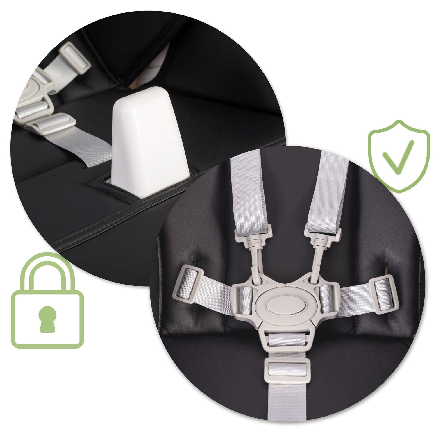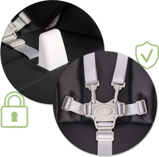 Verstelbare 5-puntsgordels en een centrale kruisriem houden je kind stevig in een veilige positie en voorkomen dat het uit de stoel glijdt.
