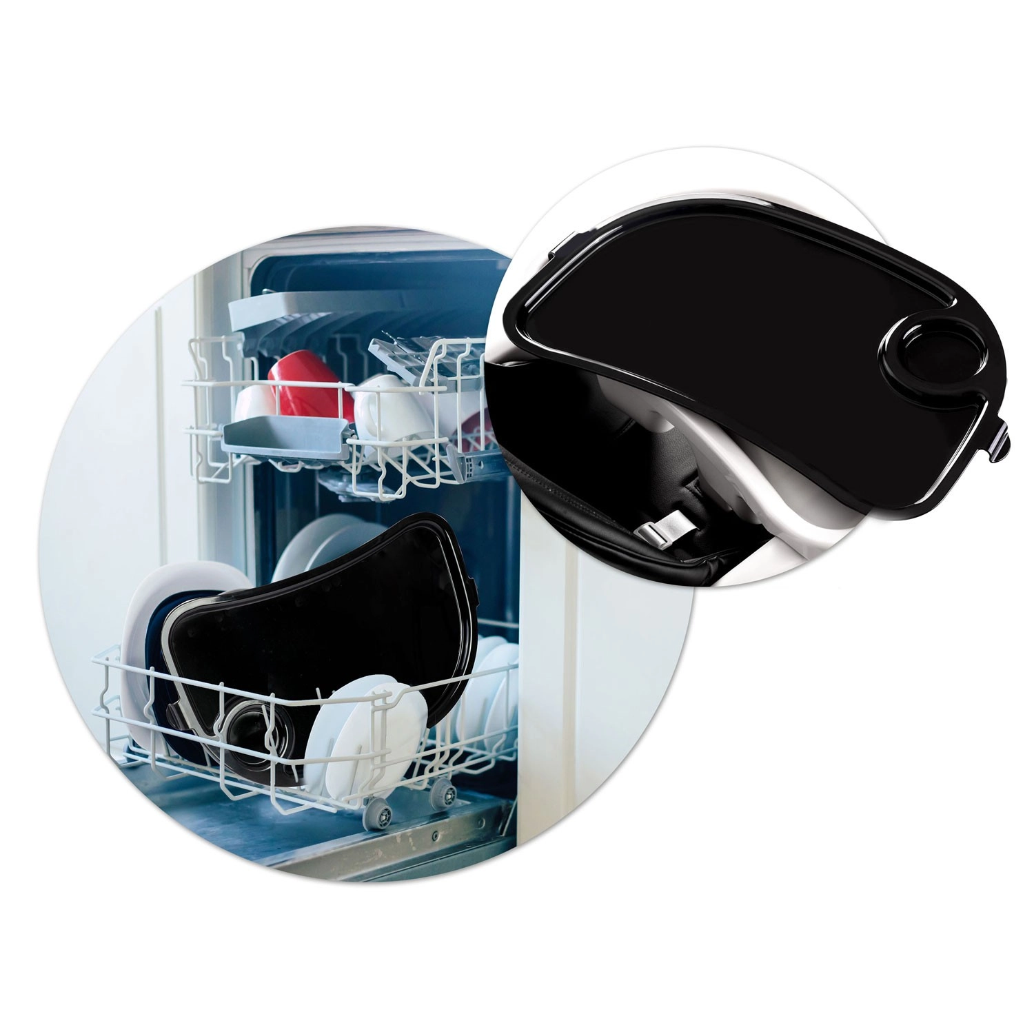 Het afneembare blad met verhoogde rand en bekerhouder maakt voeren en opruimen gemakkelijk. De inzet kan worden verwijderd en onder stromend water worden afgespoeld – snel en zorgeloos.