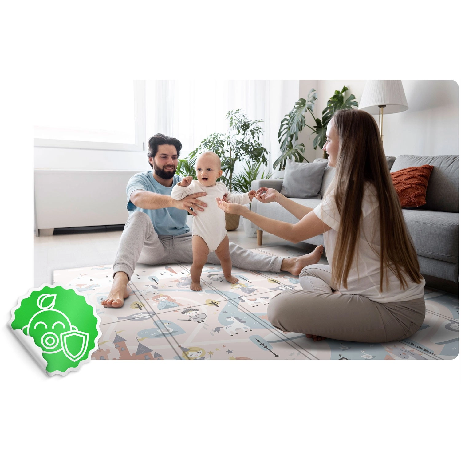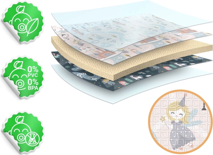 De mat vouwt snel als een accordeon, is makkelijk mee te nemen en op te bergen onder een bed of in de auto. Het waterdichte oppervlak veeg je eenvoudig schoon met een vochtige doek – ideaal thuis, op bezoek of buiten tijdens een picknick. Het materiaal is vrij van BPA/PVC/ftalaten/formamide, voldoet aan CE en is getest volgens EN71-1/2/3, voor bewezen kwaliteit en veiligheid.