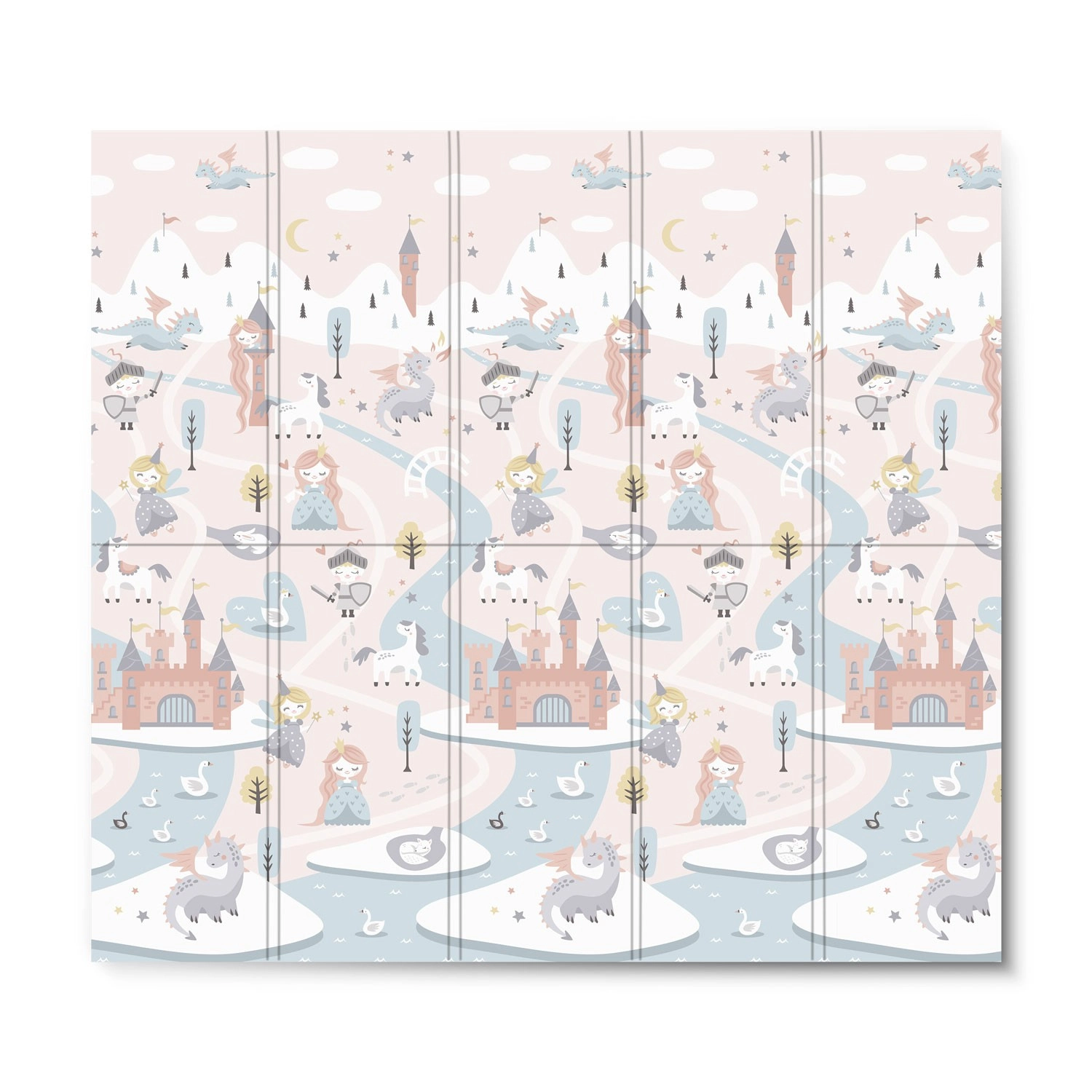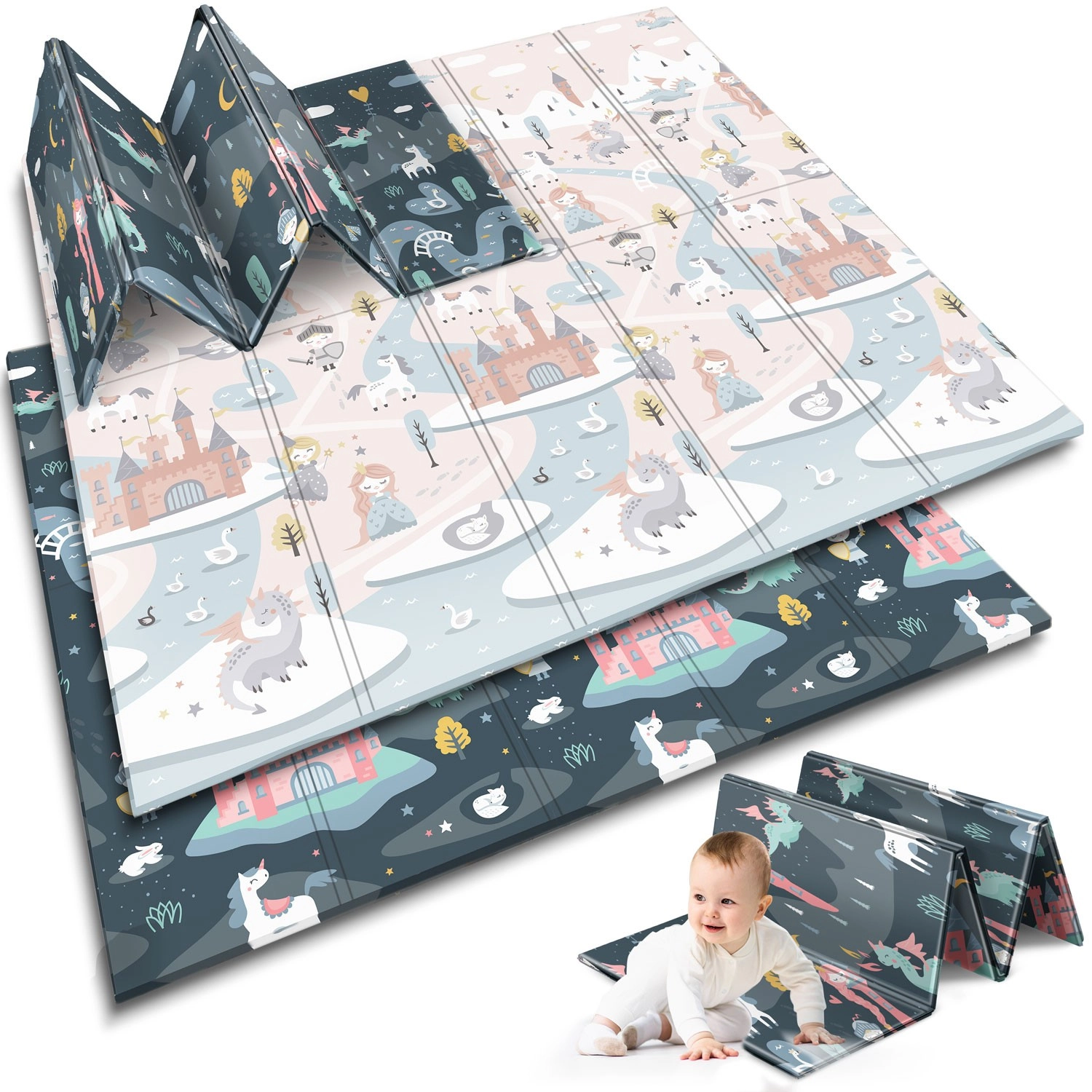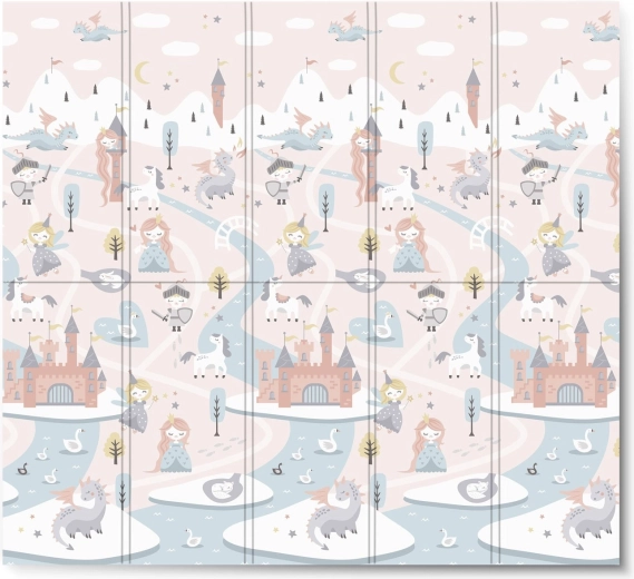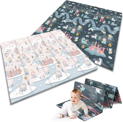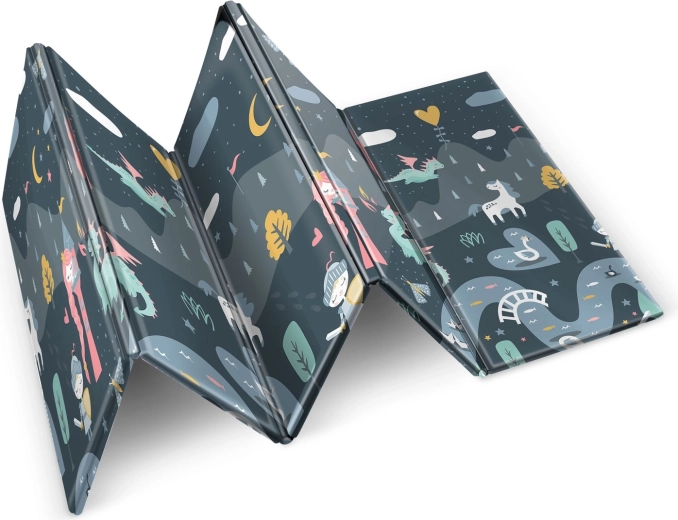 De opvouwbare NUKIDO-speelmat van premium, reukvrij XPE-schuim creëert een zachte, antislip en hygiënische ondergrond voor peuters en kleuters. Dankzij de dikte van 1 cm absorbeert hij effectief schokken, beschermt tegen harde vloeren en biedt thermische isolatie. De dubbelzijdige print biedt twee stijlen – zachte pastelmotieven en een donkerder sprookjesachtig design – zodat de mat bij het interieur past en kinderen langer blijft boeien.