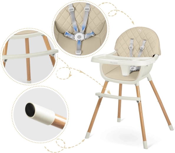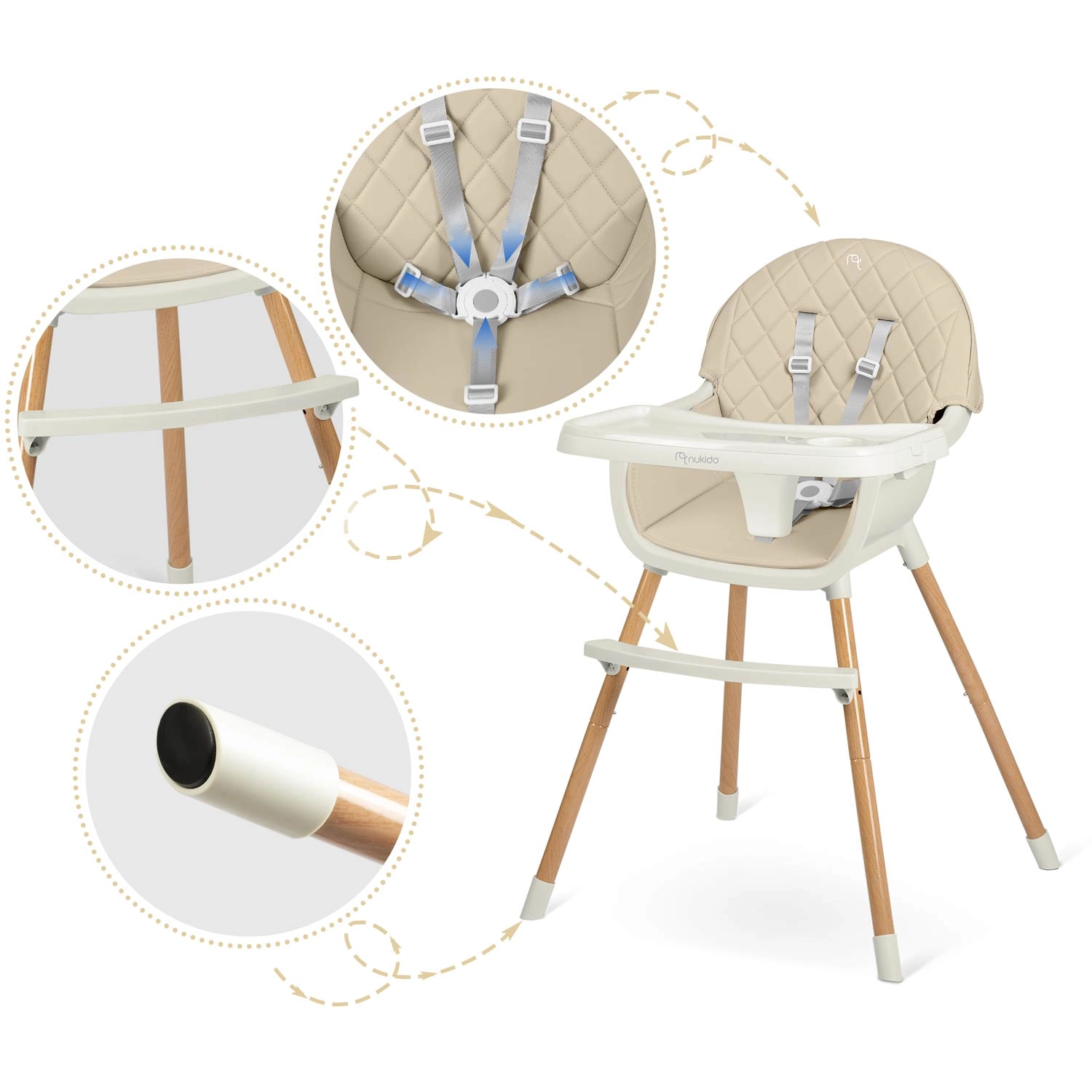 De stijlvolle en veilige kinderstoel NUKIDO Lilo in beige combineert comfort, stabiliteit en eenvoudig onderhoud. Hij biedt een afneembaar en verstelbaar tafeltje met opstaande randen, een 5-punts veiligheidsgordel, stabiele poten met antislipdoppen en comfortabel kussenmateriaal dat geen vuil absorbeert. Ideaal om te voeden, spelen en leren.