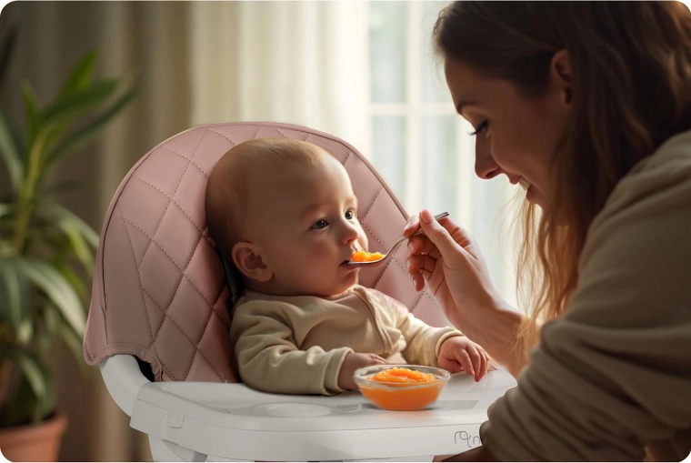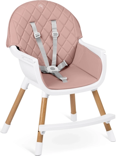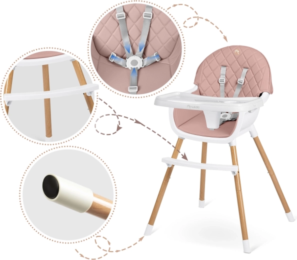 De veiligheid wordt gegarandeerd door 5-puntsgordels, stabiele stalen poten met houtlook en anti-slip doppen. De stoel voldoet aan de strenge Europese norm EN 14988. Ideaal niet alleen om te voeden, maar ook voor spelen, tekenen en lezen – het kind zit comfortabel en in de juiste houding.