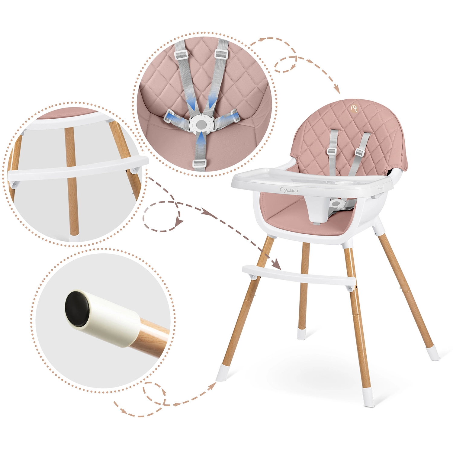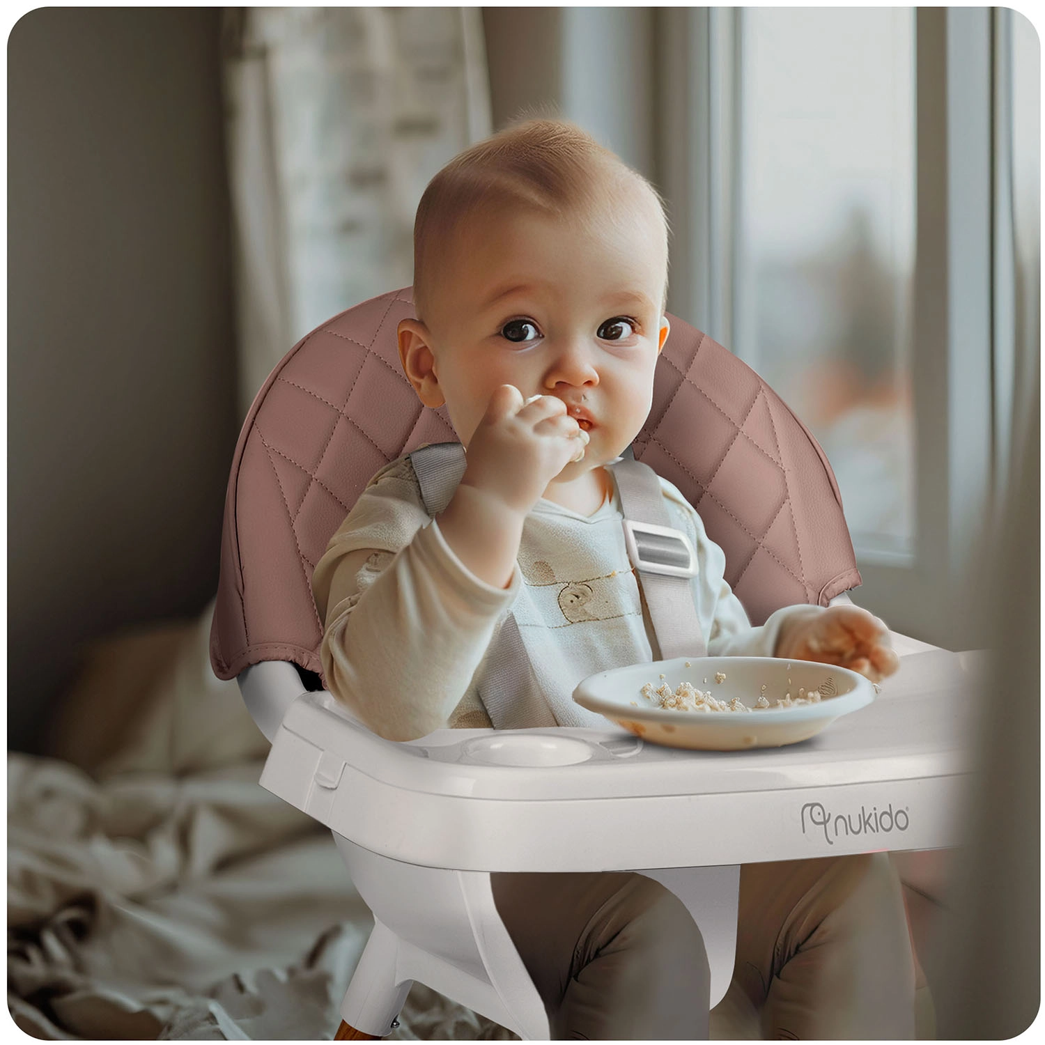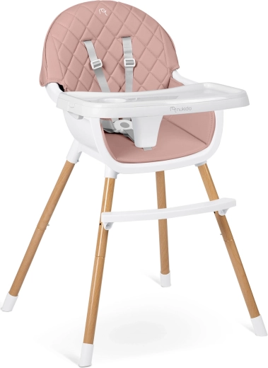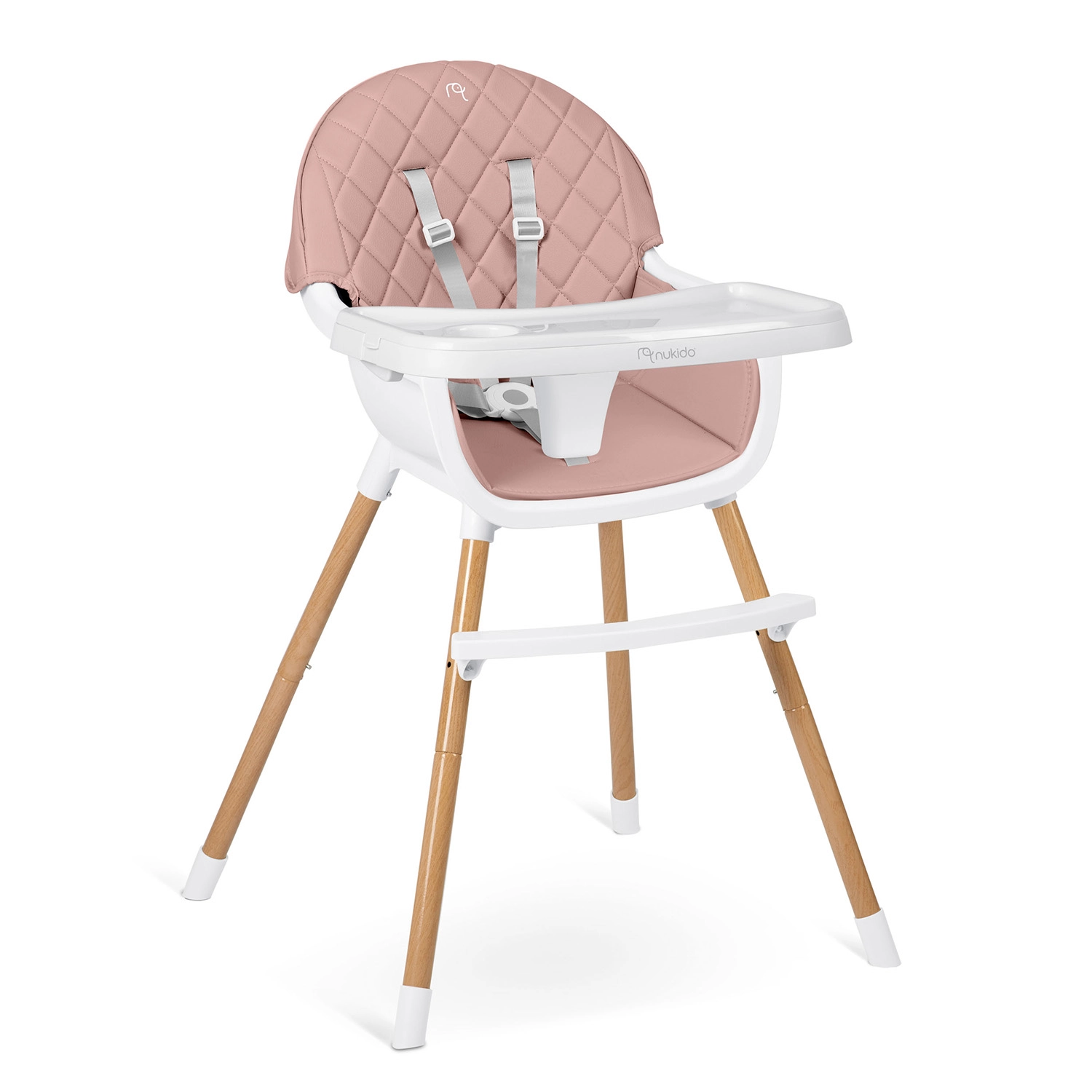 NUKIDO Lilo is een praktische kinderstoel die meegroeit met je kind. Dankzij twee standen voor bladverstelling pas je de ruimte voor je kind eenvoudig aan; het blad kan bovendien volledig worden verwijderd voor zelfstandig aan tafel zitten. De zachte, gewatteerde zitting van materiaal dat geen vuil opneemt, hoef je na het eten alleen maar af te vegen.