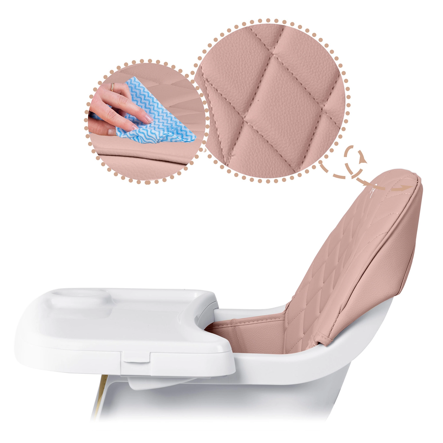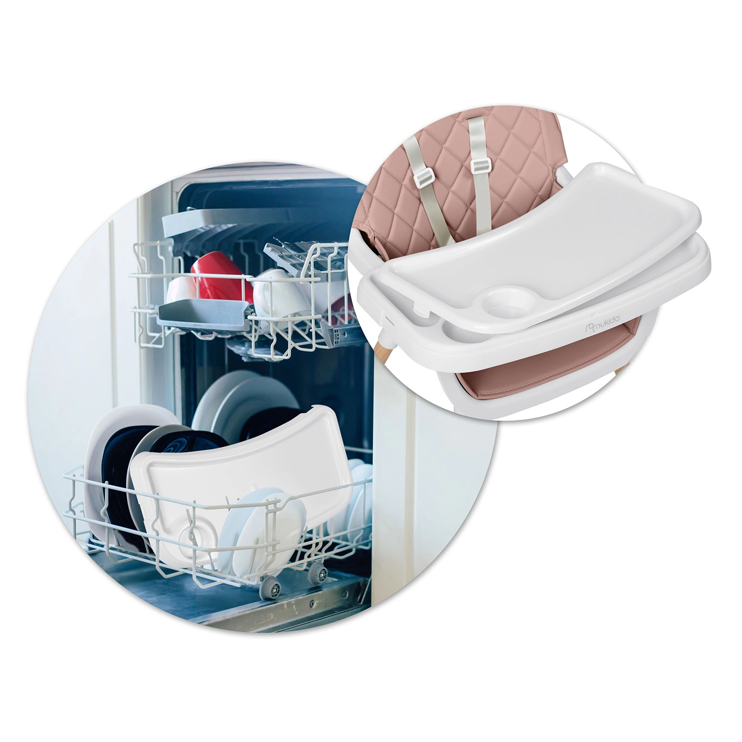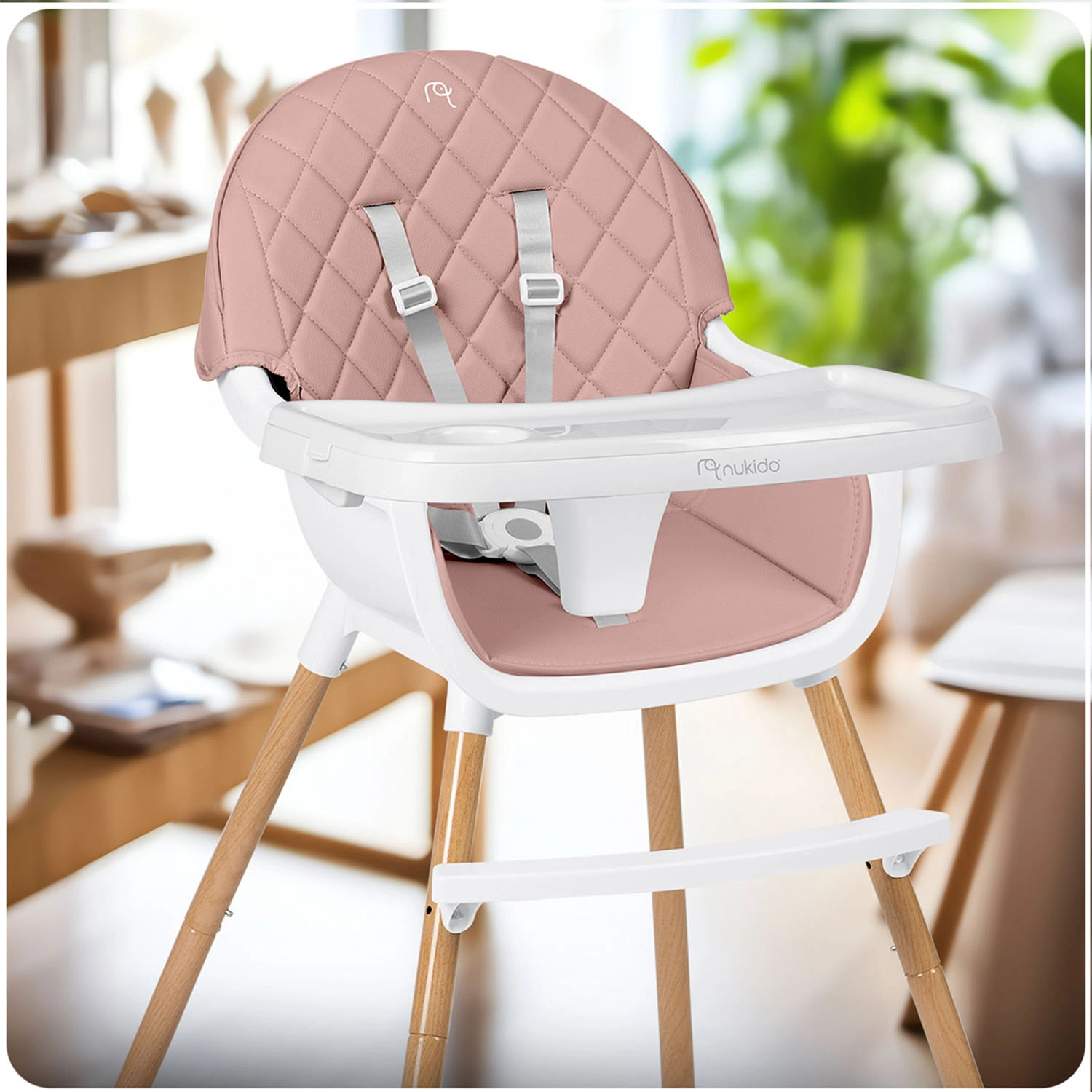 NUKIDO Lilo is een praktische kinderstoel die meegroeit met je kind. Dankzij twee standen voor bladverstelling pas je de ruimte voor je kind eenvoudig aan; het blad kan bovendien volledig worden verwijderd voor zelfstandig aan tafel zitten. De zachte, gewatteerde zitting van materiaal dat geen vuil opneemt, hoef je na het eten alleen maar af te vegen.