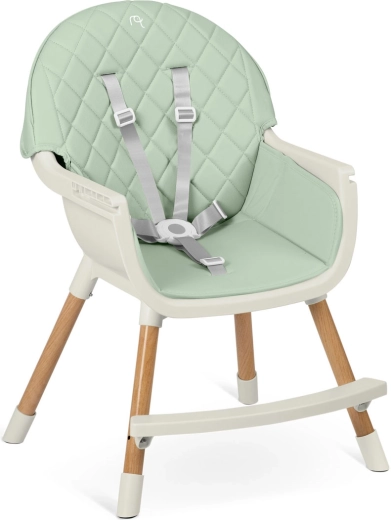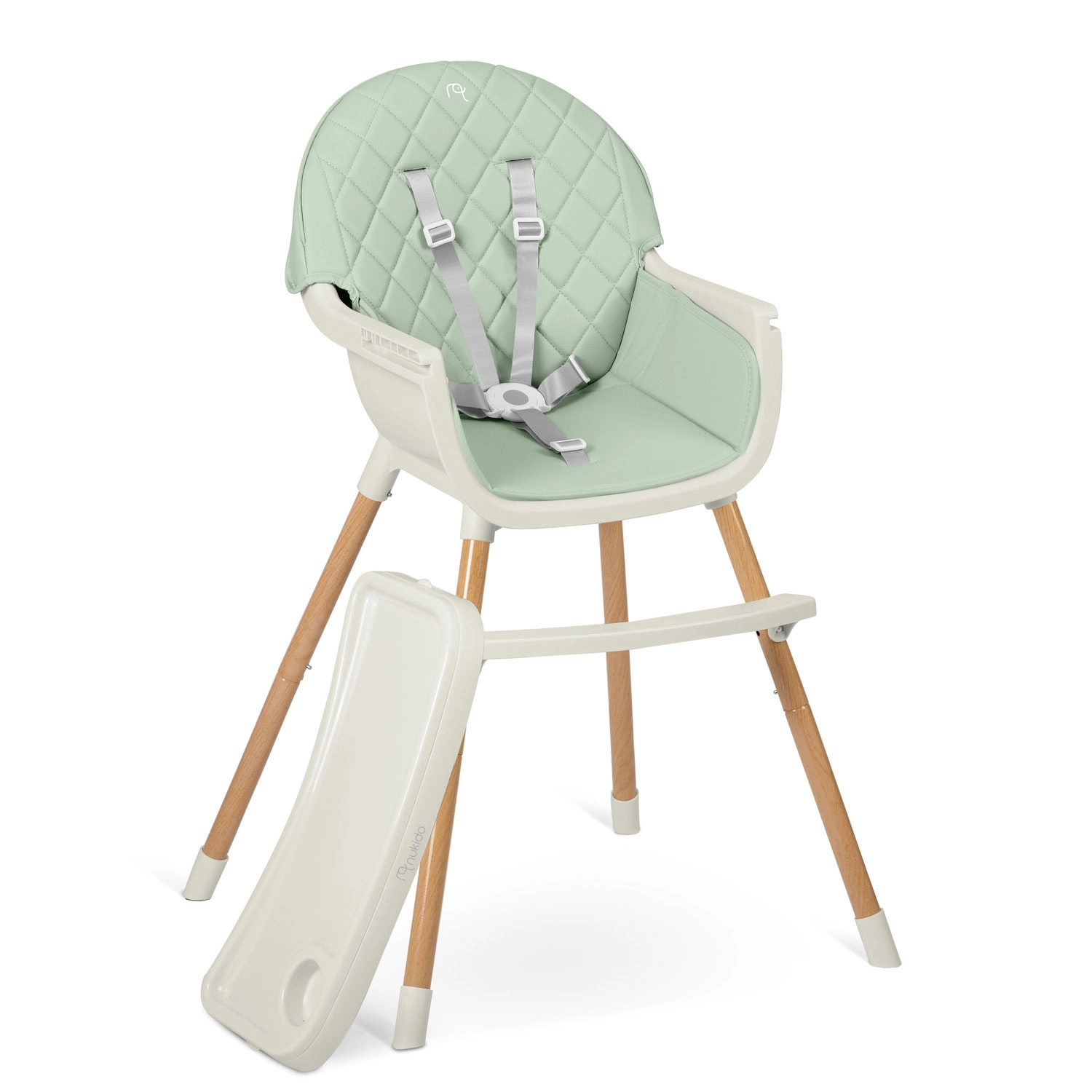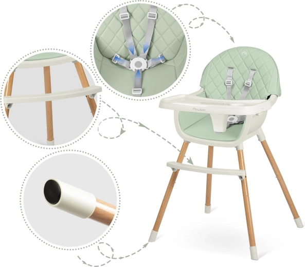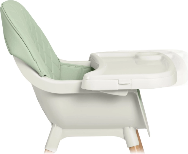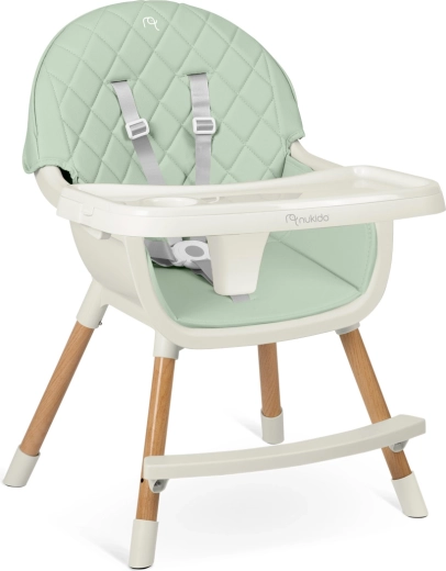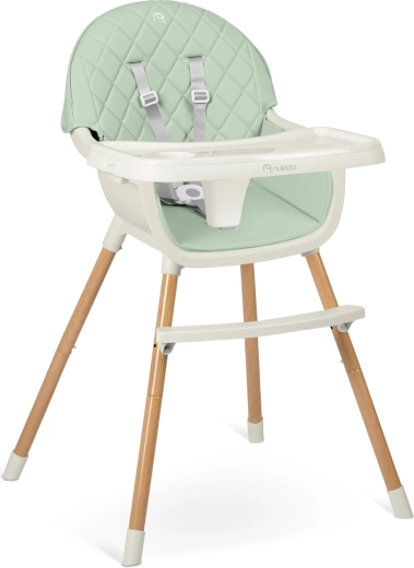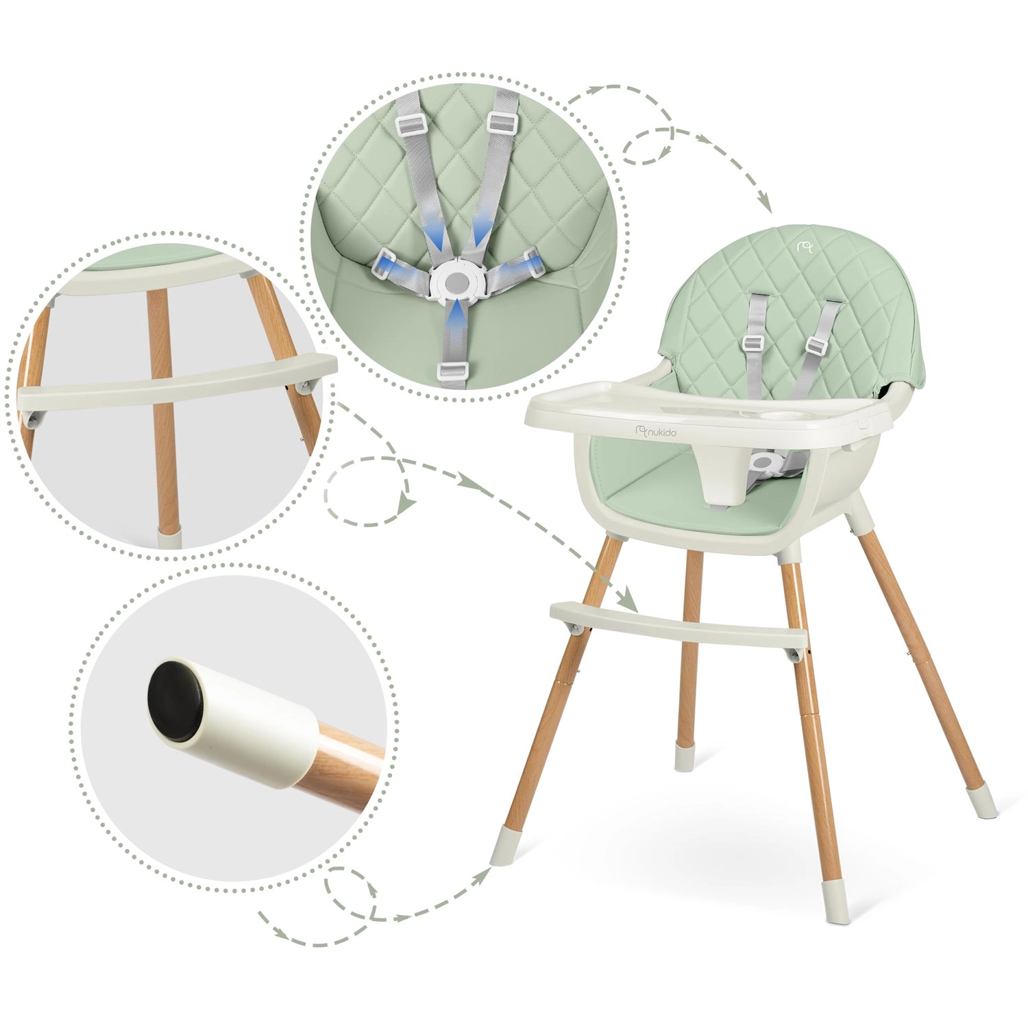 Praktische kinder eetstoel NUKIDO Lilo 3-in-1 in mint combineert veiligheid, comfort en eenvoudig reinigen. Biedt een afneembaar blad met inzet, 5-punts veiligheidsgordels, stabiele poten met antislip en een verstelbare voetensteun. Ideaal om te voeden, spelen en leren – voldoet aan EN 14988.