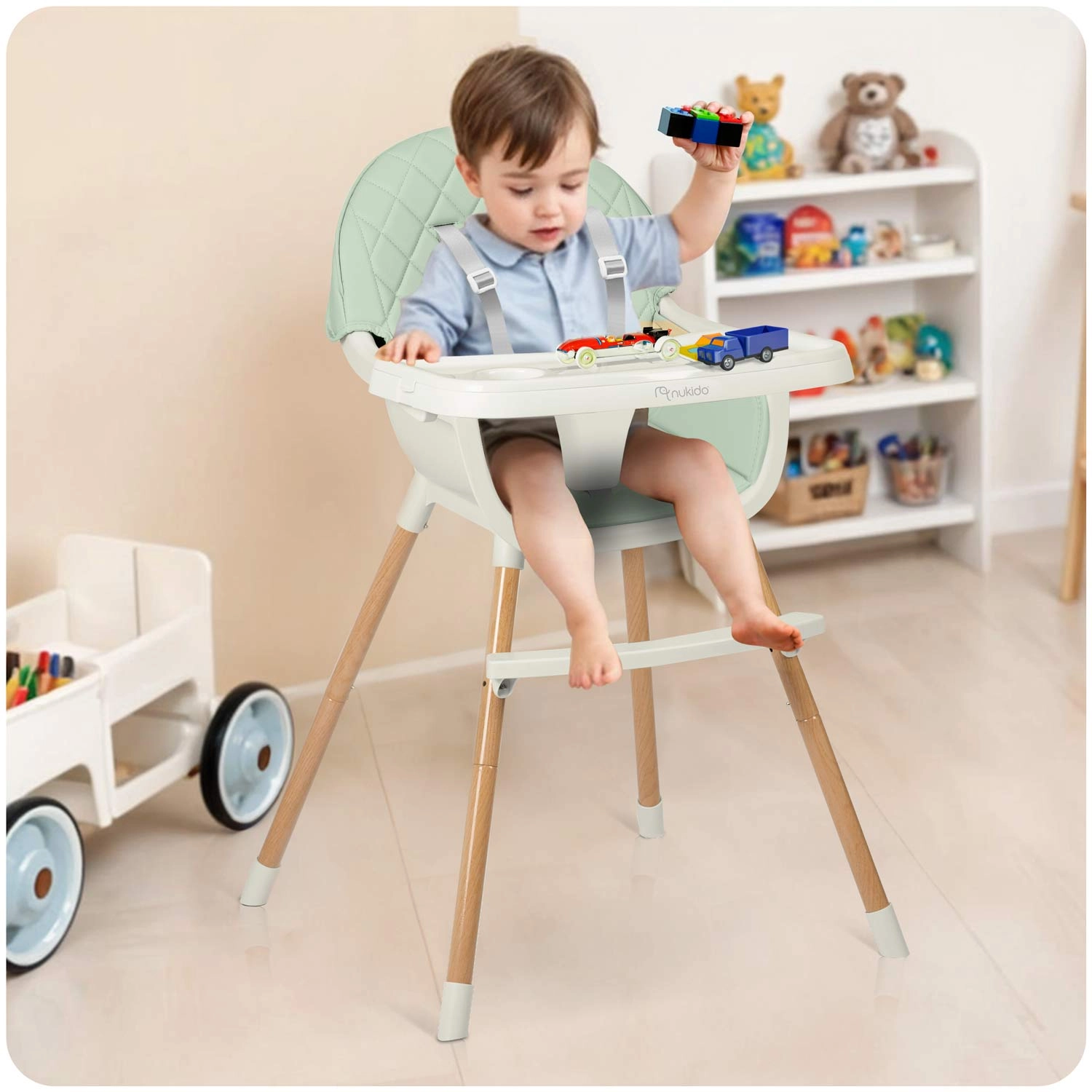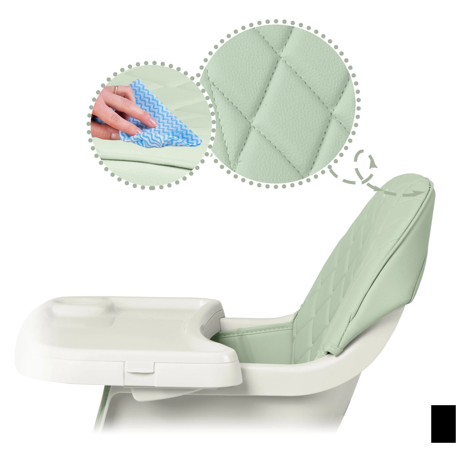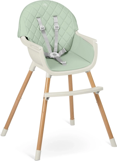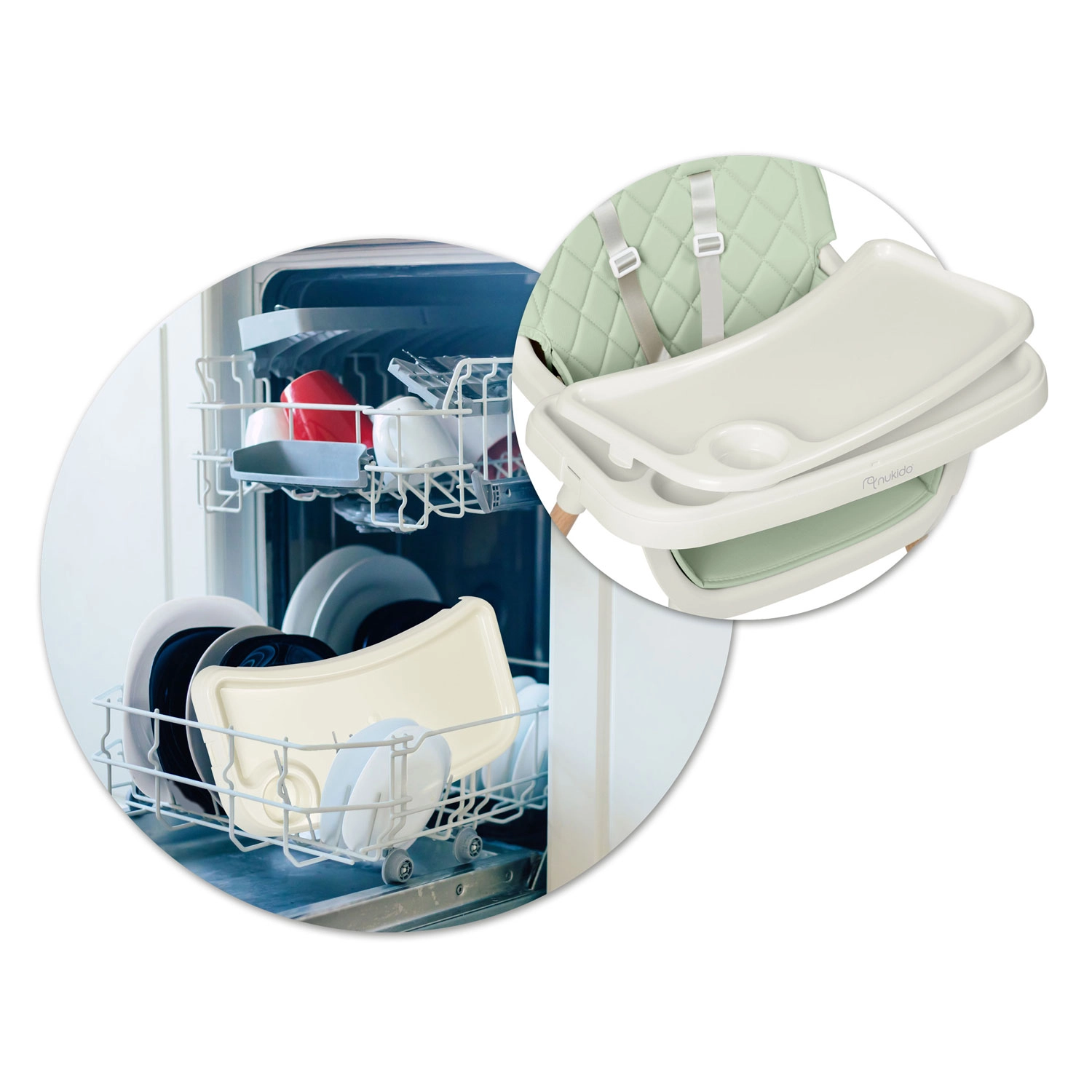 Praktische kinder eetstoel NUKIDO Lilo 3-in-1 in mint combineert veiligheid, comfort en eenvoudig reinigen. Biedt een afneembaar blad met inzet, 5-punts veiligheidsgordels, stabiele poten met antislip en een verstelbare voetensteun. Ideaal om te voeden, spelen en leren – voldoet aan EN 14988.