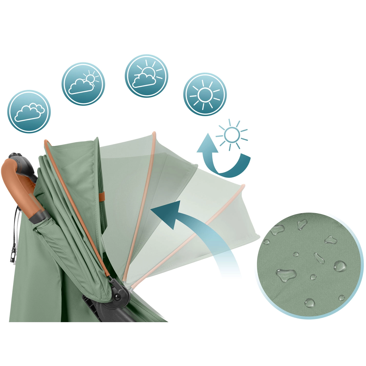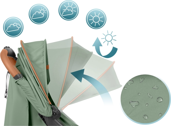 Uitbreidbare canopy met meerdere standen beschermt tegen zon, wind en lichte regen. Waterafstotend materiaal en variabele schaduw voor slapen en om de omgeving te bekijken.