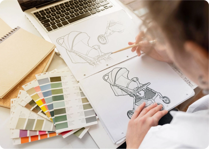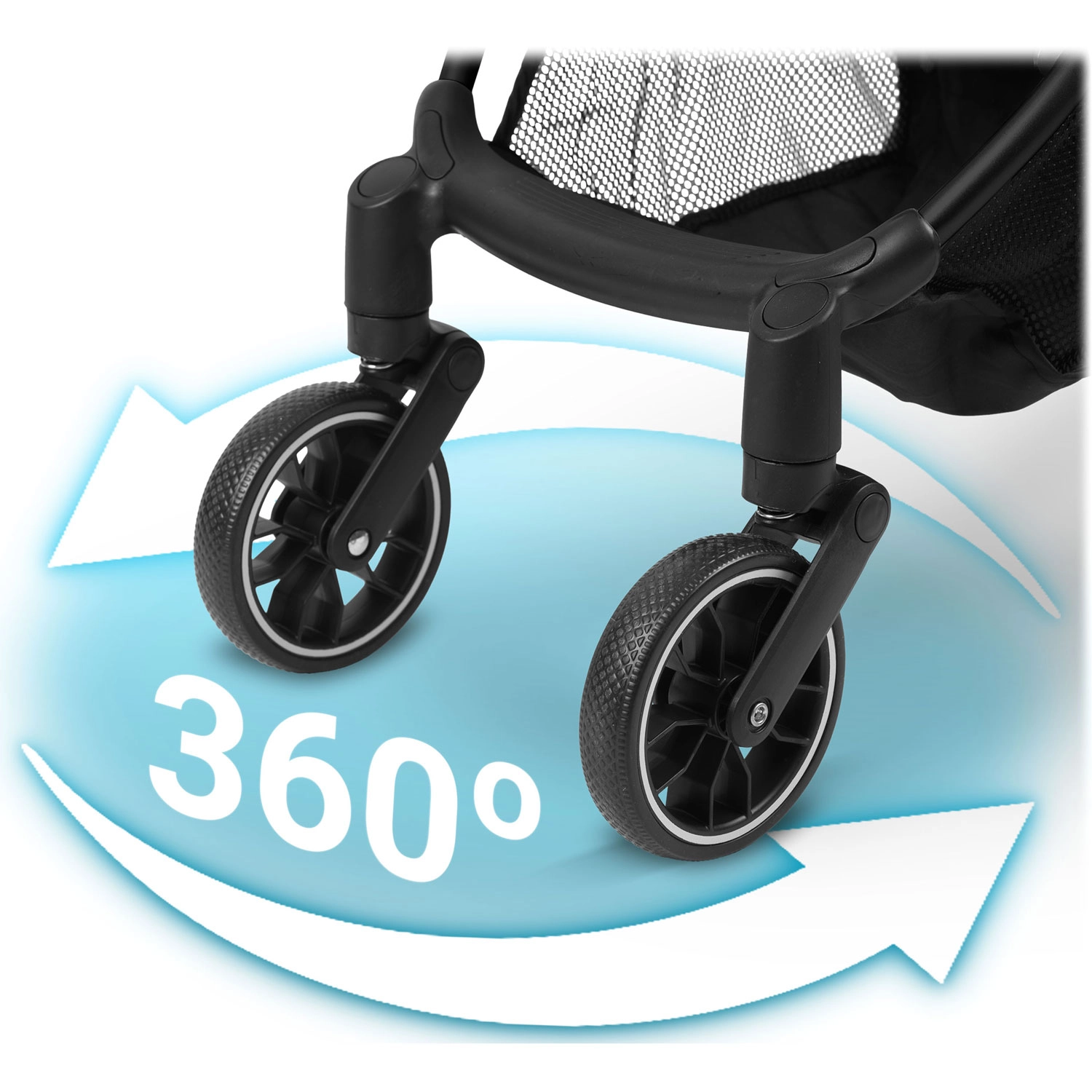 Zwenkbare voorwielen met stabiele demping en grote achterwielen nemen oneffenheden en scherpe bochten moeiteloos. Betere wendbaarheid, minder schokken, meer comfort voor het kind.