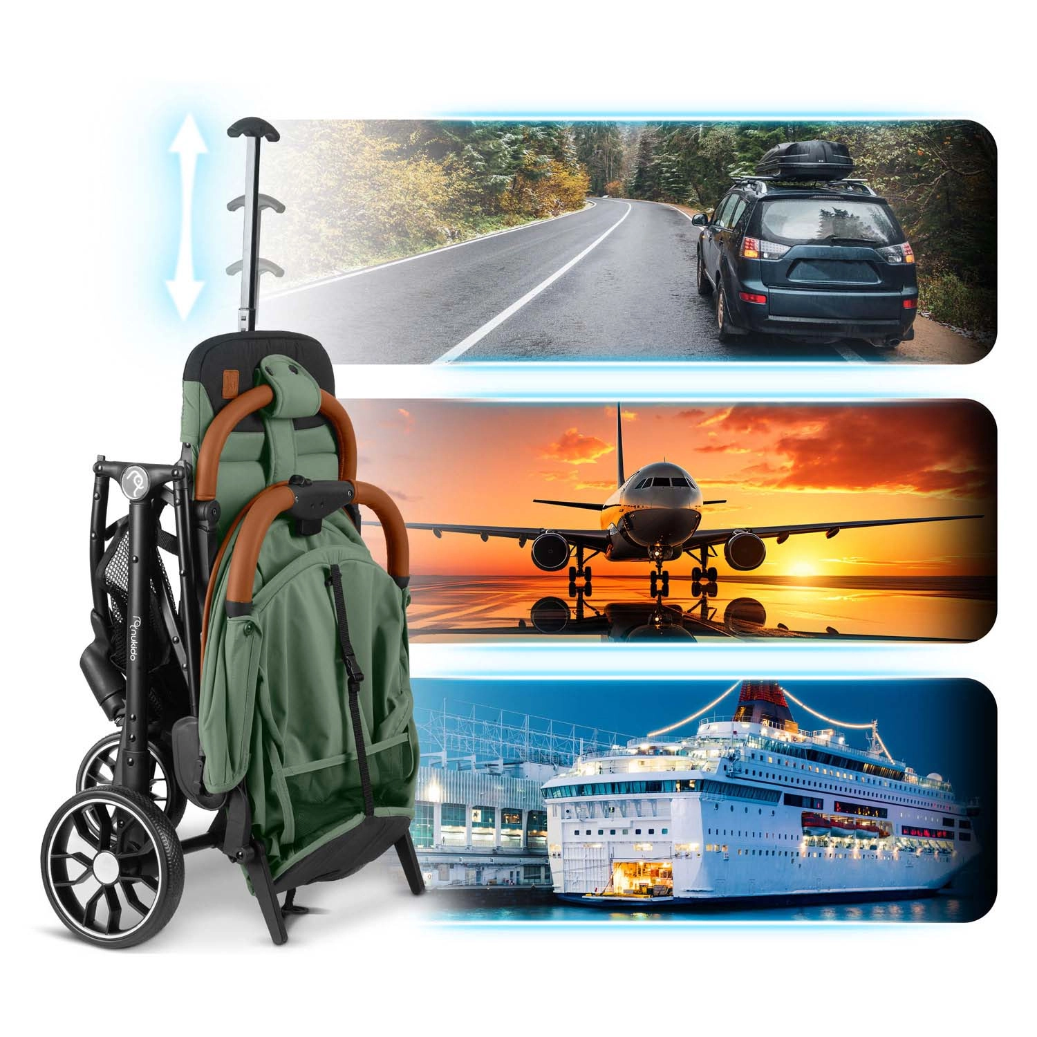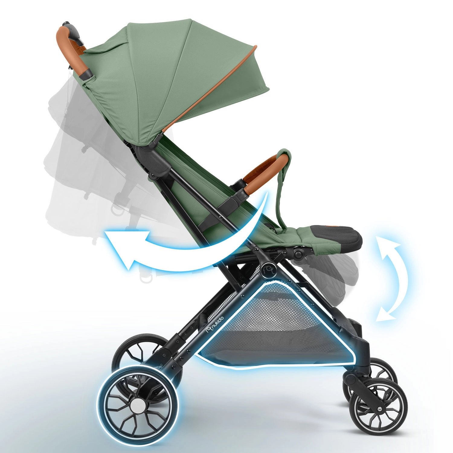 Nukido Paseo combineert comfort, veiligheid en praktische details in een elegant design. Dankzij het duurzame en lichte frame is hij eenvoudig te bedienen, terwijl de geveerde 360°-voorwielen en de grotere achterwielen voor licht terrein zorgen voor een soepele rit in de stad en in het park. Het kind wordt beschermd door gepolsterde vijfpuntsgordels en een uitbreidbare zonnekap met bescherming tegen zon en lichte regen.