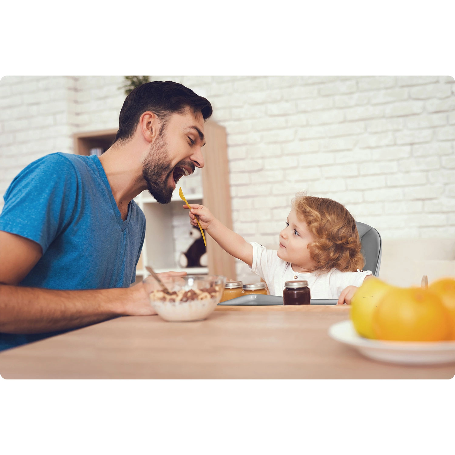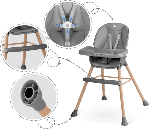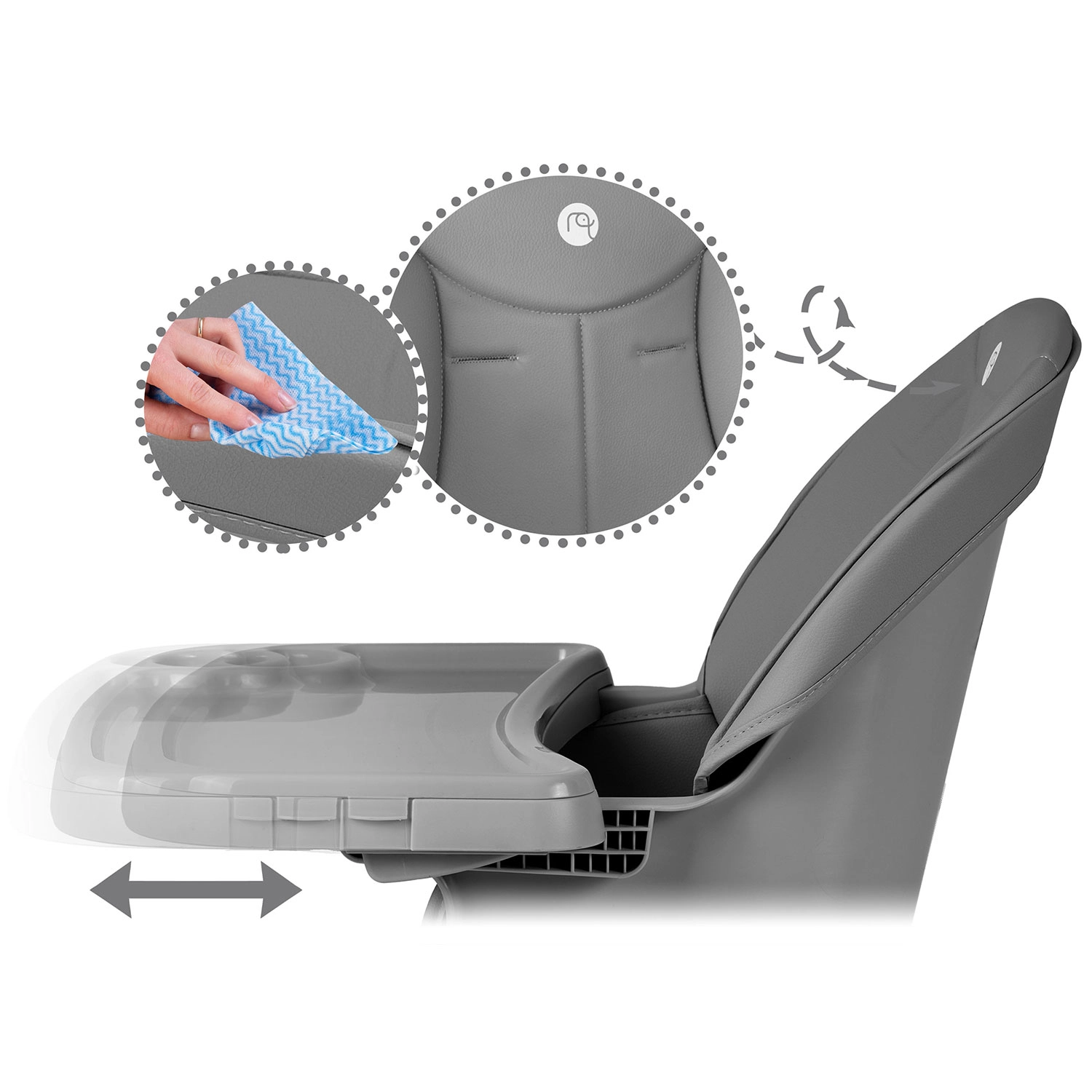 Voor maximale veiligheid is de stoel voorzien van een 5-punts veiligheidsgordel, een stabiele brede basis met antislip voetjes en een stevige voetensteun voor een correcte lichaamshouding. Het blad is naar je toe te schuiven/van je af te bewegen en kan indien nodig volledig worden verwijderd, zodat het kind direct aan de eettafel kan zitten.