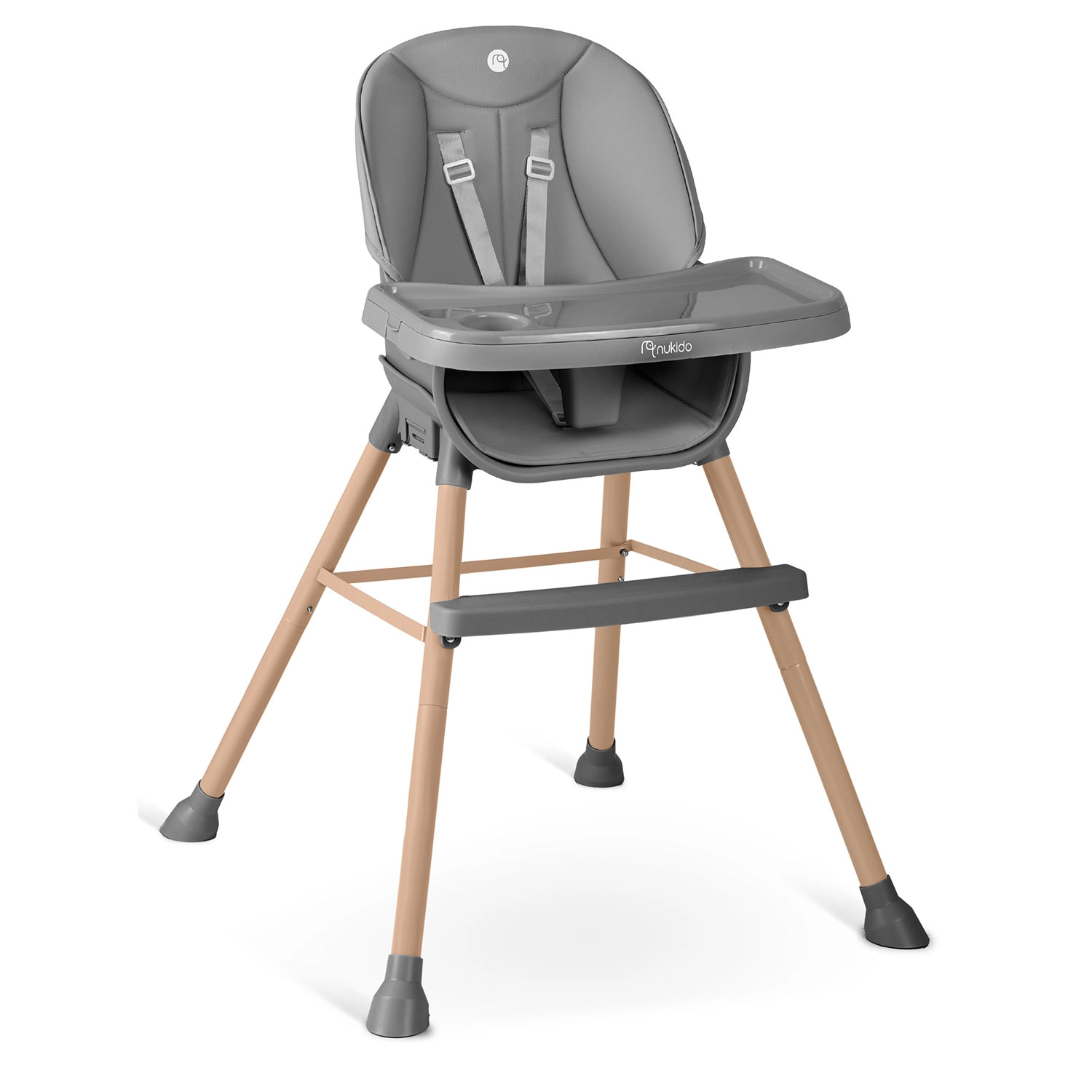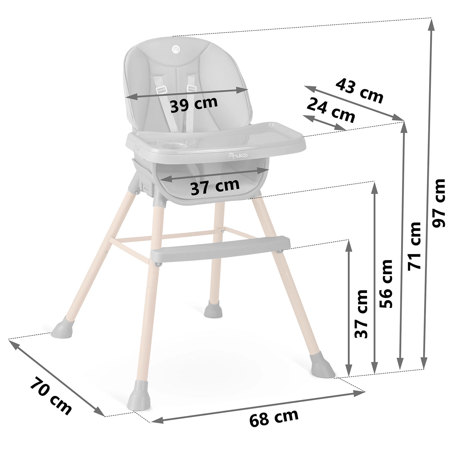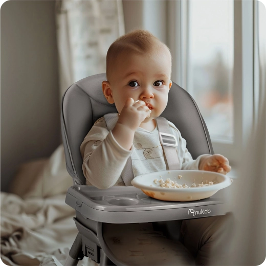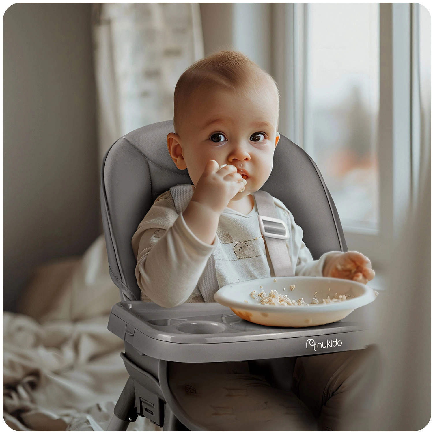 De NUKIDO Tilo 3-in-1 is een multifunctionele kinderstoel die comfort, veiligheid en eenvoudig onderhoud combineert. Dankzij het doordachte ontwerp pas je hem moeiteloos aan verschillende ontwikkelingsfasen en activiteiten aan – van tafelen tot spelen aan een lage tafel. Het afneembare blad met opstaande rand en inzet vereenvoudigt het dagelijkse schoonmaken, terwijl de zachte bekleding van vuilafstotend materiaal slechts hoeft te worden afgenomen.
