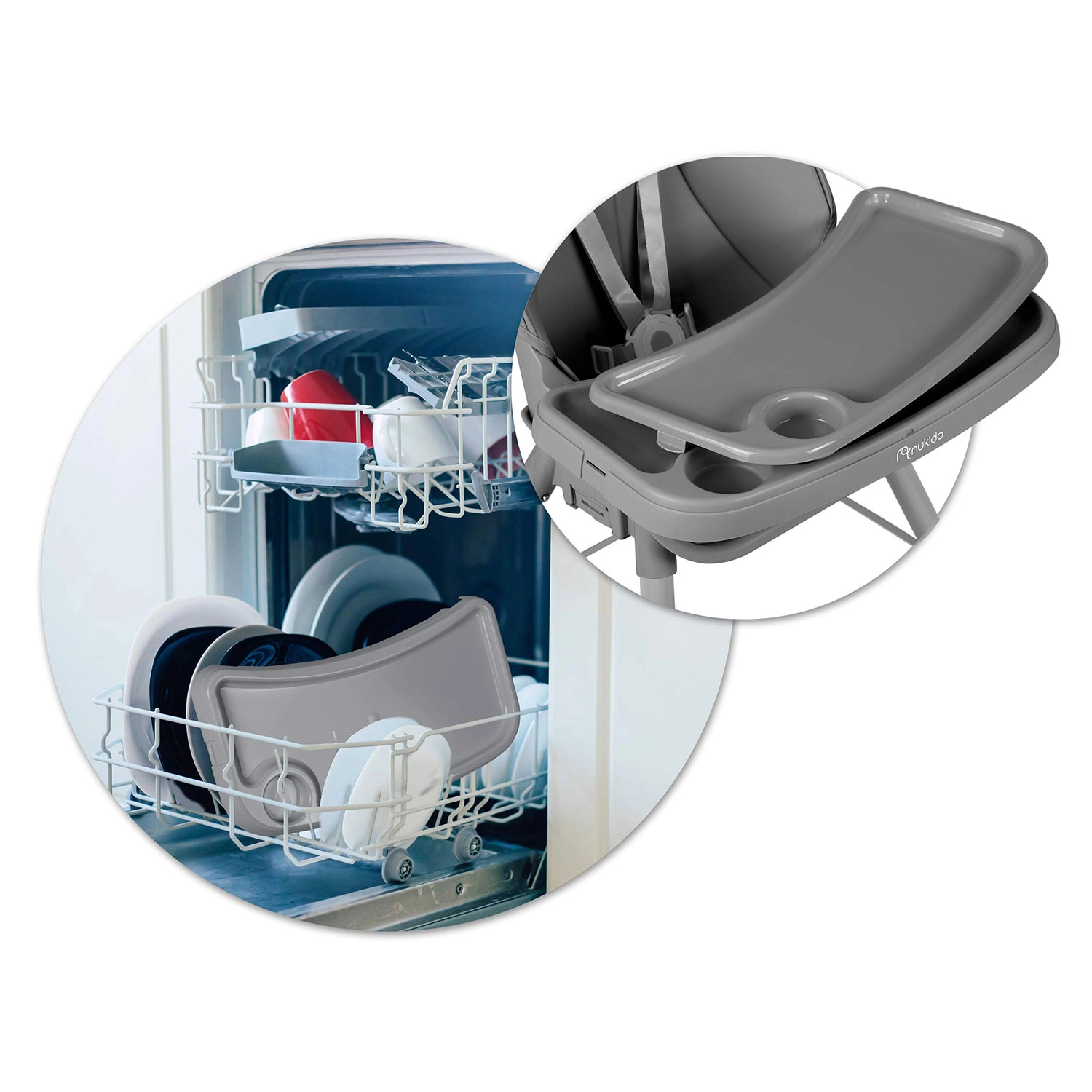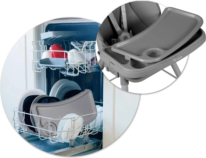 De afneembare inzet van het blad met opstaande rand houdt knoeien tegen en kan onder stromend water of in de vaatwasser worden gereinigd. Het zitoppervlak is niet-absorberend.