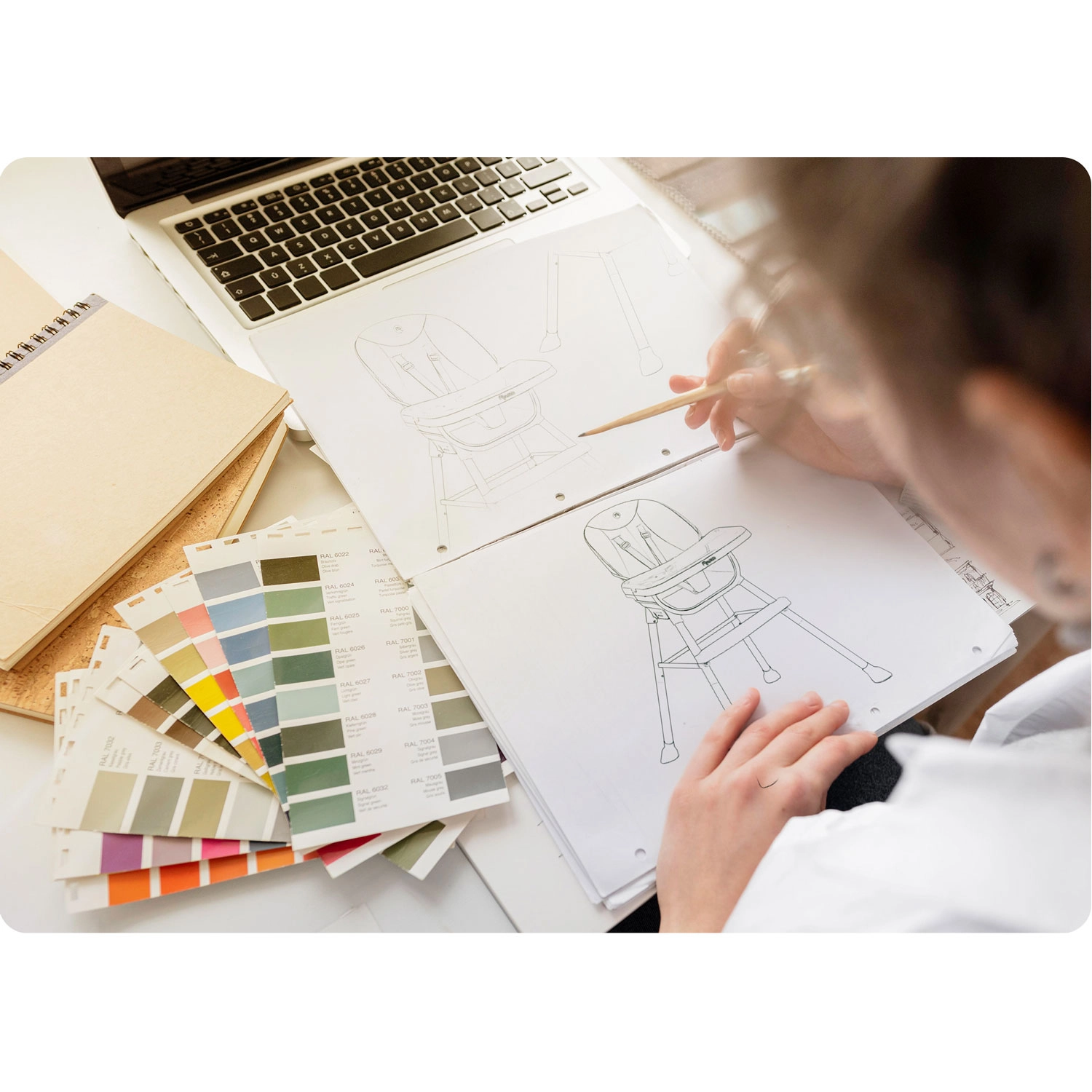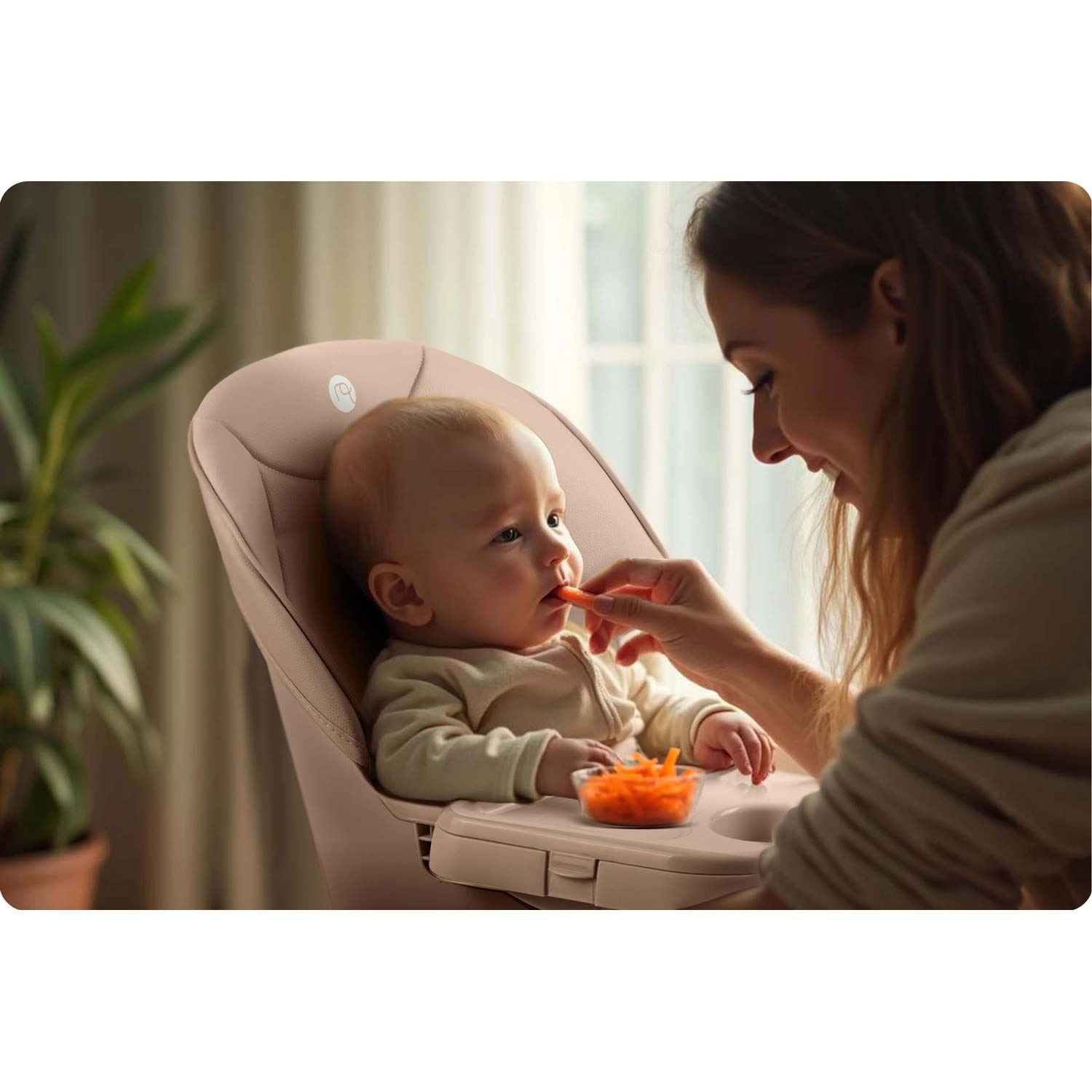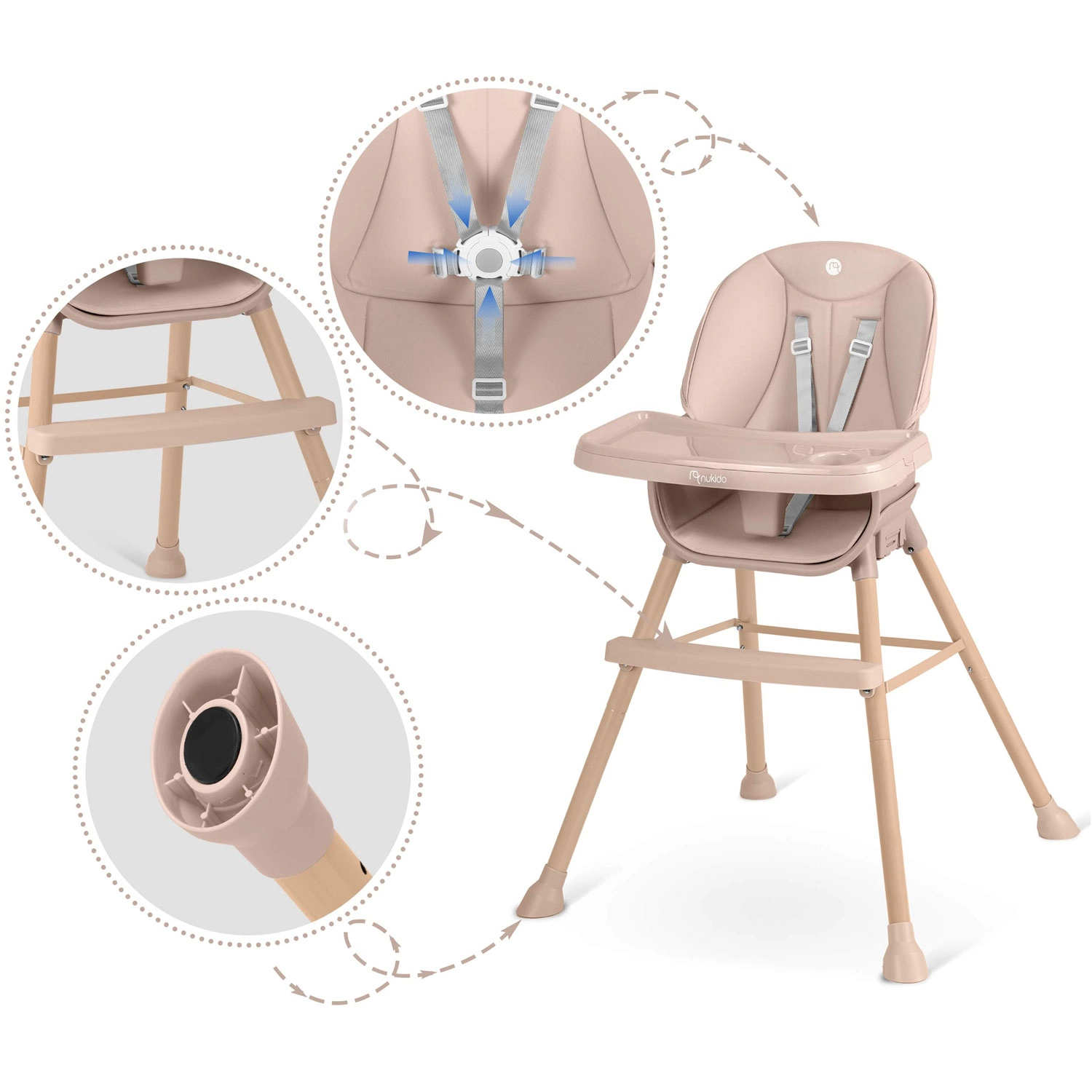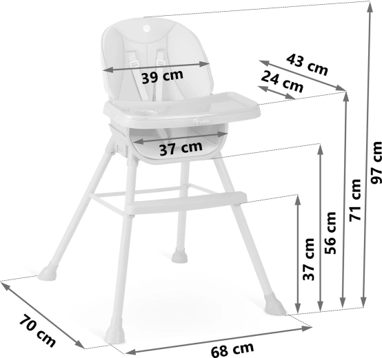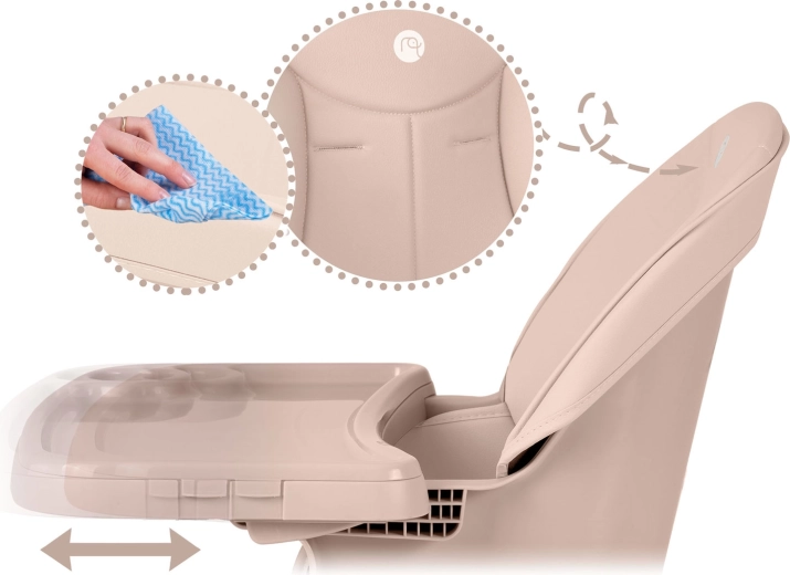Praktische details maken Tilo ideaal voor dagelijks gebruik: de niet-absorberende bekleding veeg je af met een vochtige doek, de 5-puntsgordels houden je kind veilig op zijn plek en de stevige stalen onderstelconstructie met antislip doppen zorgt voor stabiliteit op diverse oppervlakken. Ideaal om te eten, tekenen, bouwen met blokken en voor de eerste zelfstandige leesmomenten.