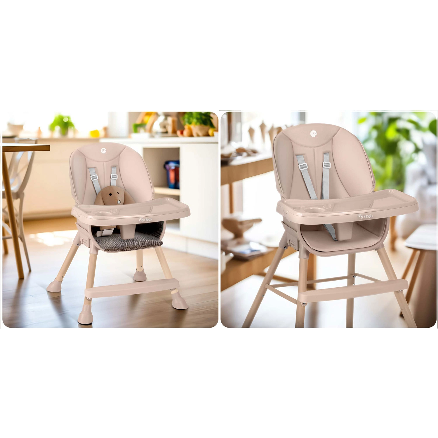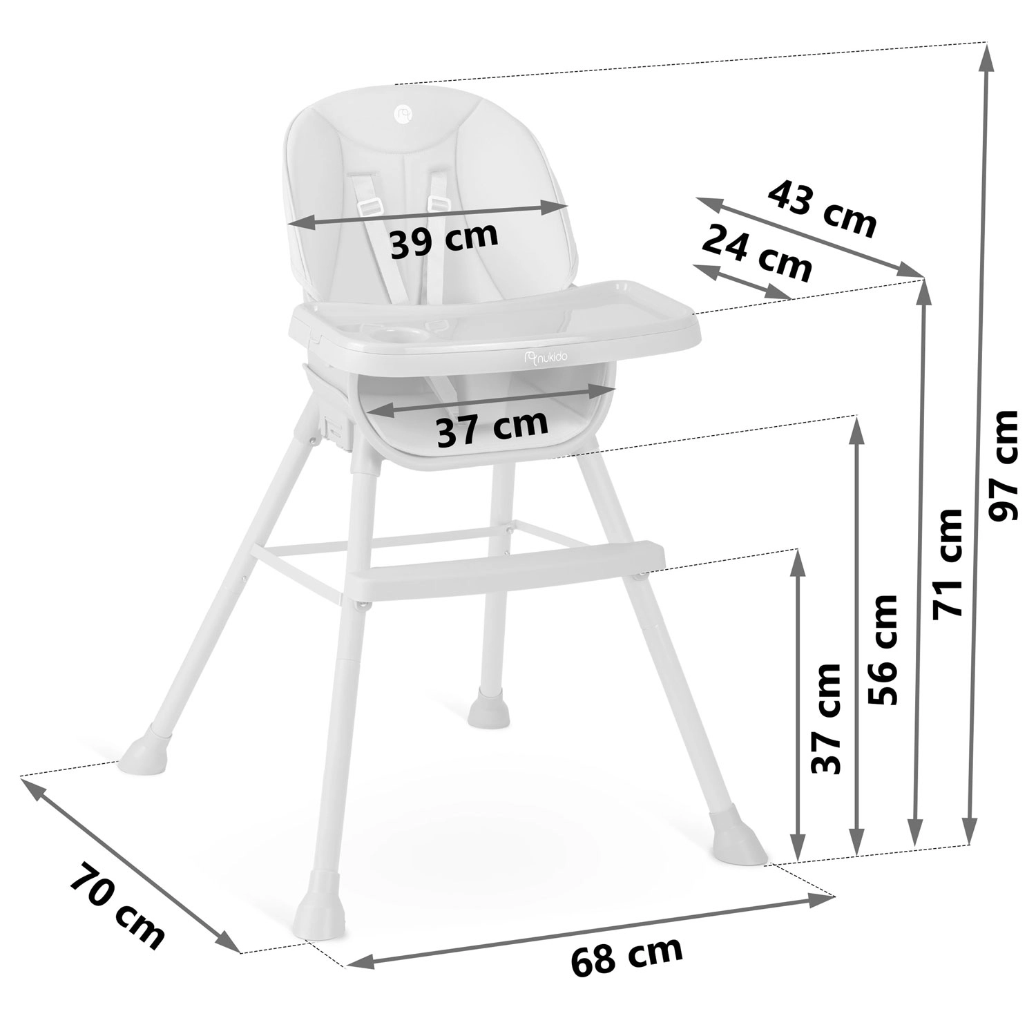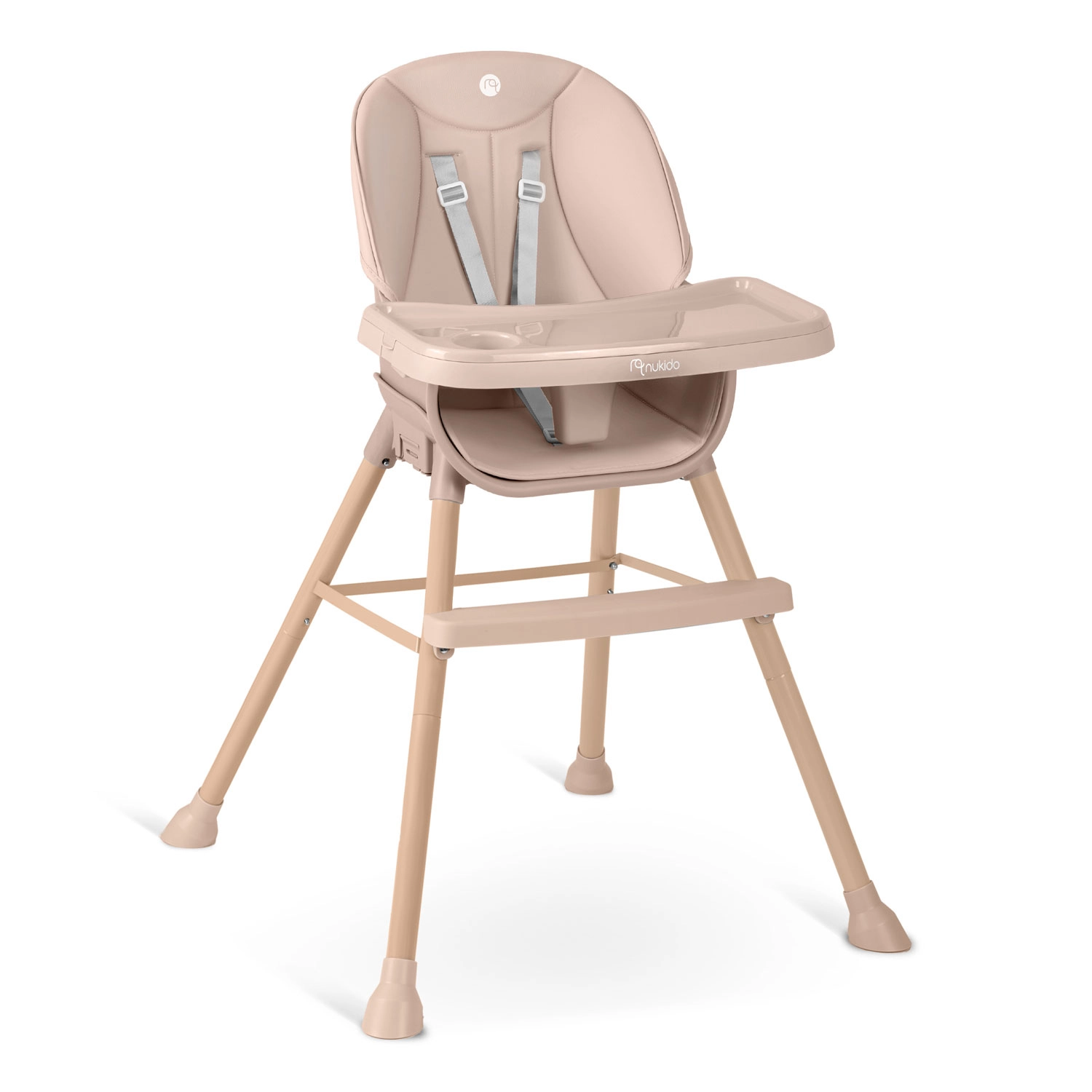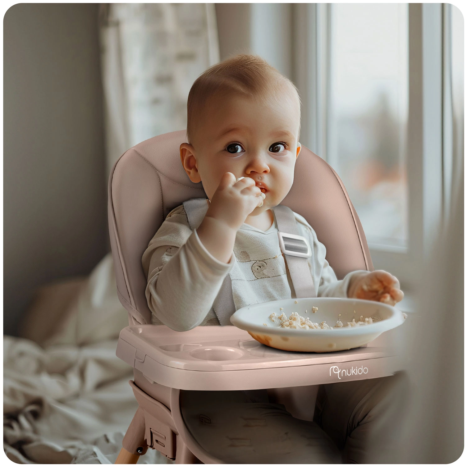 NUKIDO Tilo is een veelzijdige 3-in-1 kinder-eetstoel die je eenvoudig omzet van een hoge kinderstoel naar een lage peuterstoel of een los zitje. Dankzij de traploos verstelbare afstand van het blad en de snel los te maken inzet houd je alles in een mum van tijd schoon – haal de inzet eruit en spoel af of plaats in de vaatwasser.