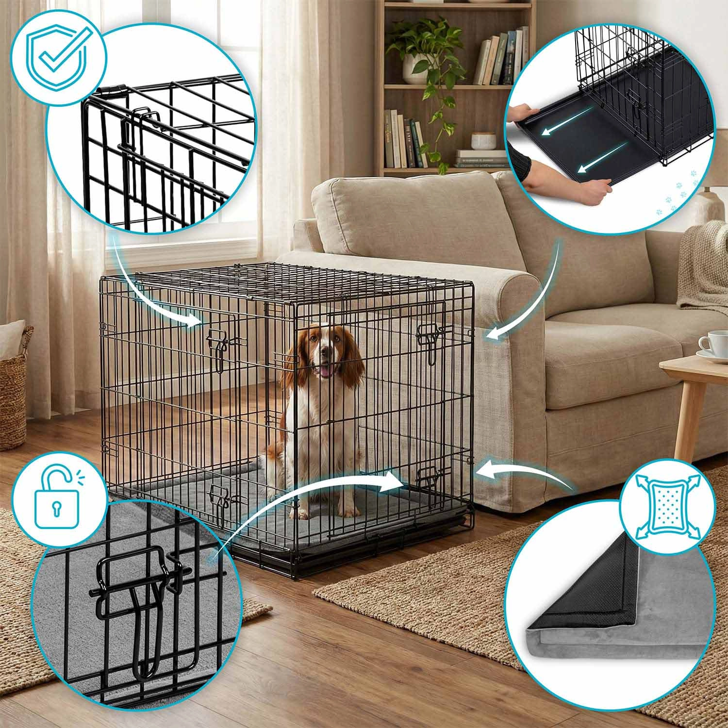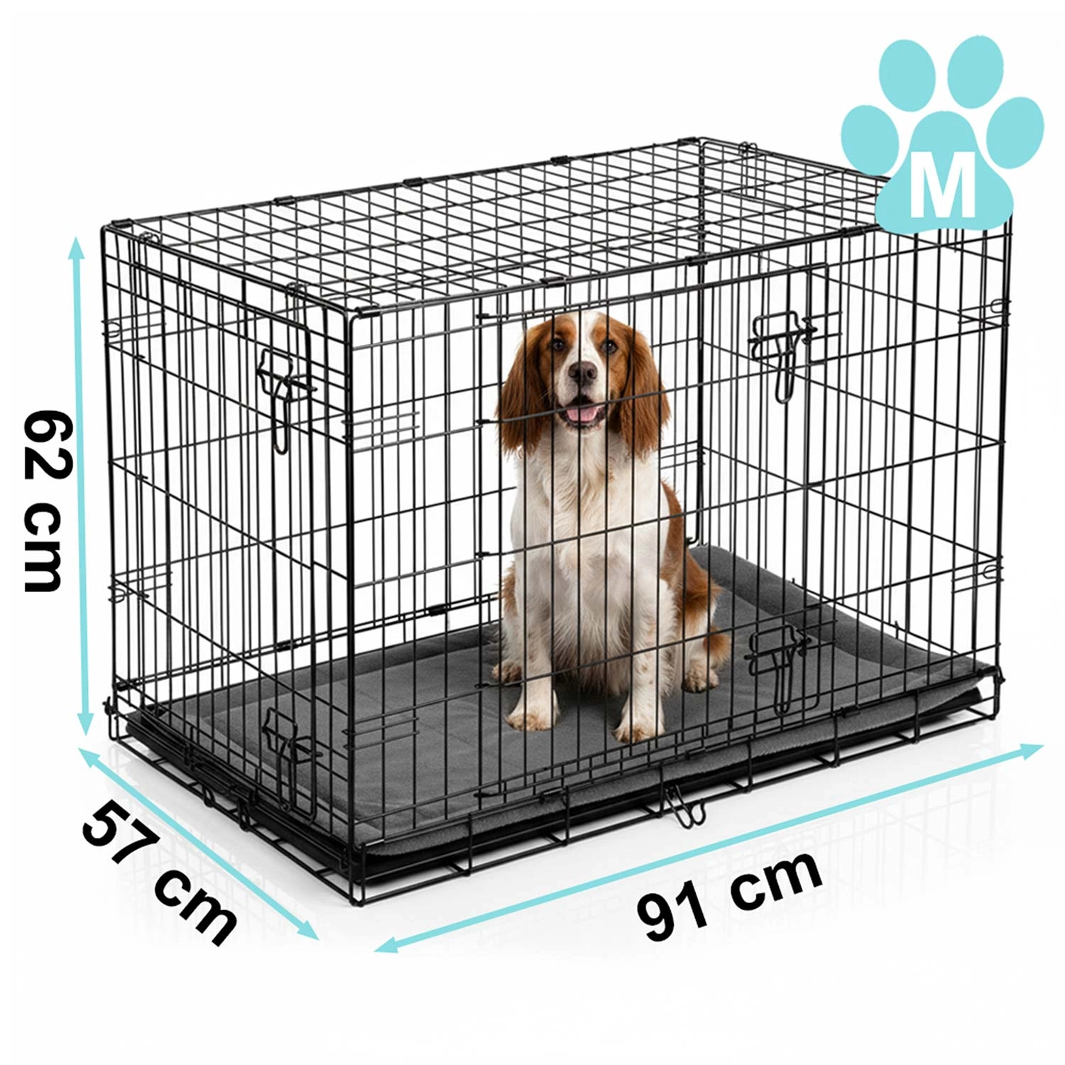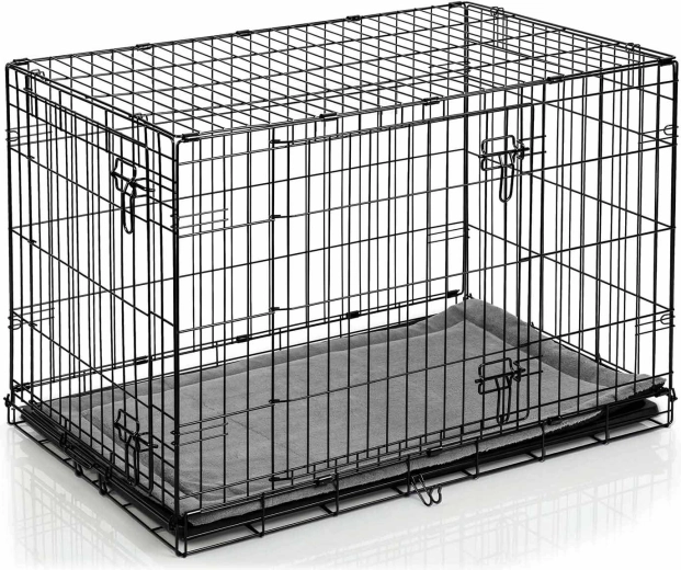 Deze metalen bench voor honden in maat M combineert een stevig stalen frame met doordachte details voor dagelijks gebruik. Twee deuren, aan de zijkant en voorkant met betrouwbare grendels vergemakkelijken de plaatsing in huis en zorgen voor veilige afsluiting. De uitneembare kunststof lekbak maakt snel reinigen en optimale hygiëne mogelijk. In de verpakking zit ook een comfortabele mat die het rustcomfort verhoogt.