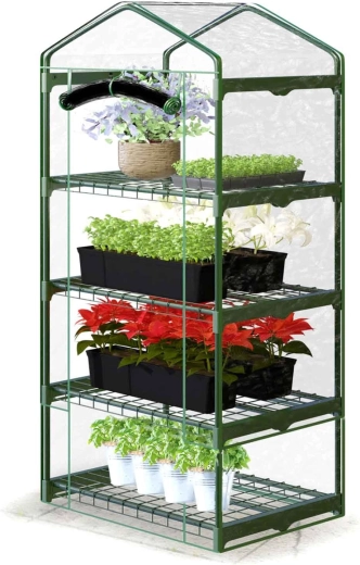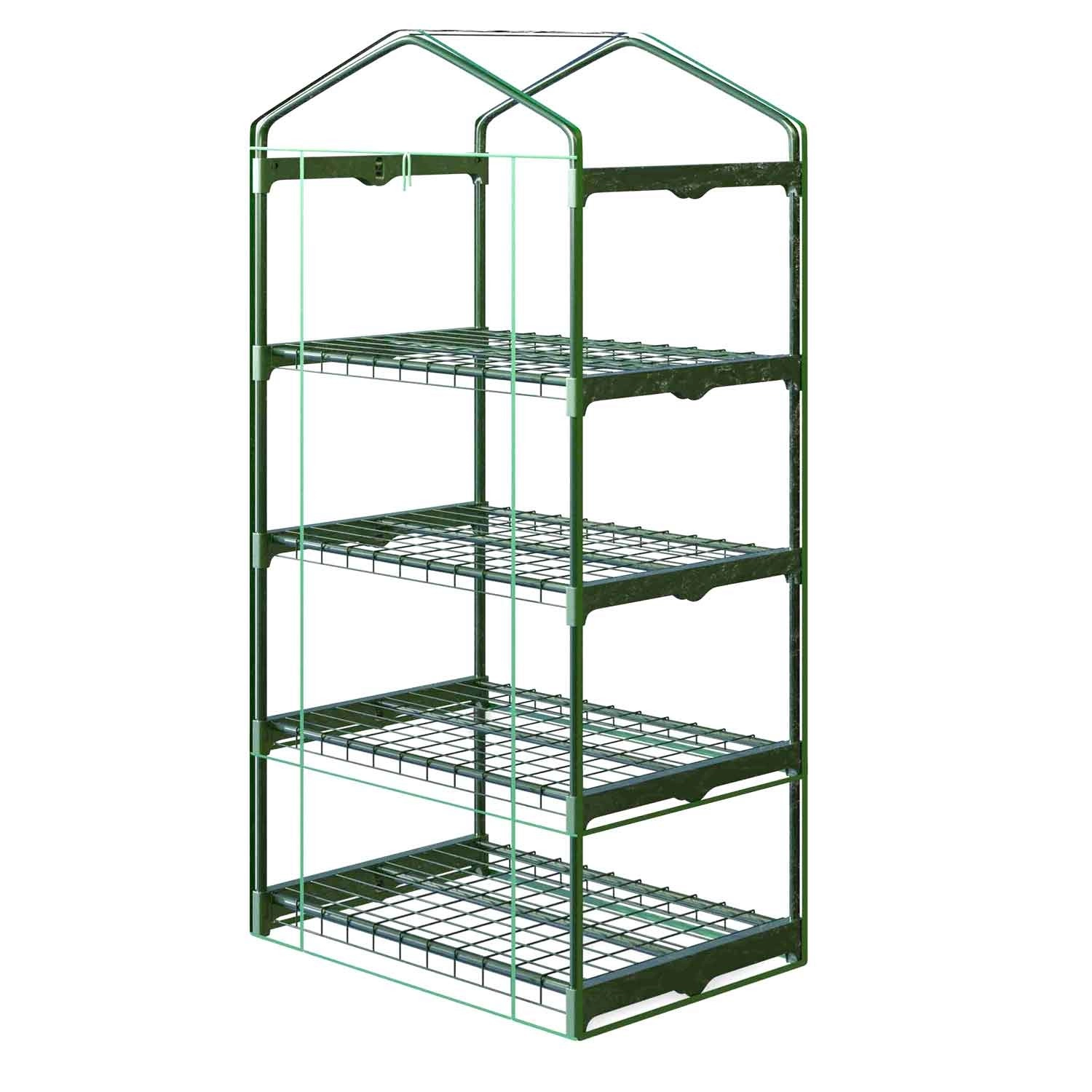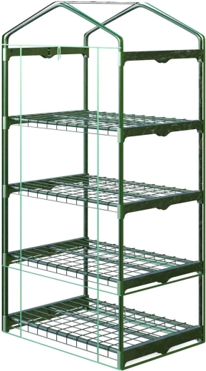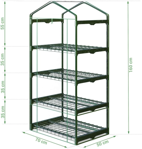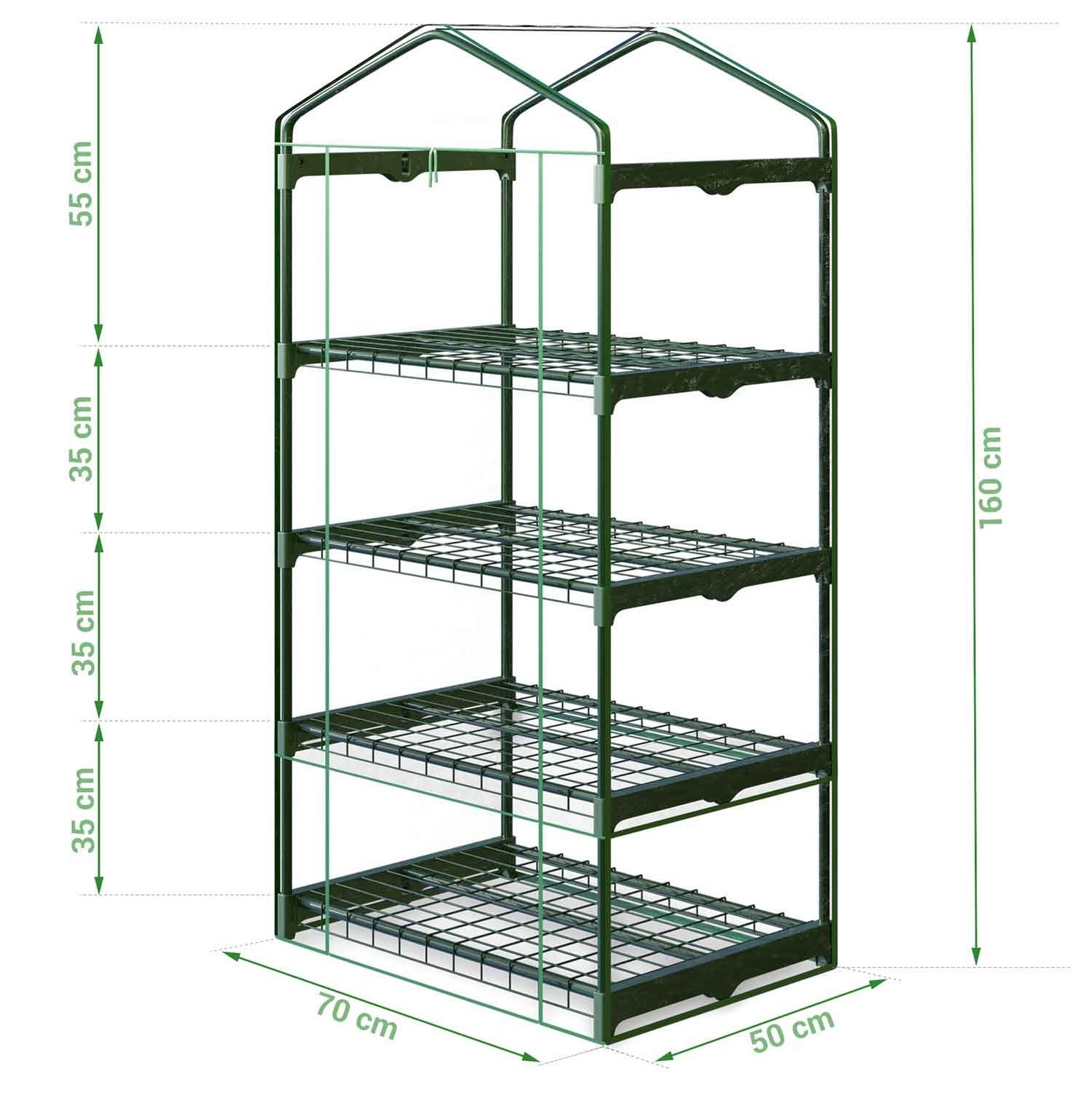 Dankzij de schappen krijgt u een overzichtelijke indeling van zaailingen en kweekpotten, en de onderruimte kan worden gebruikt voor tuinaccessoires. De voorste deur met twee ritsen zorgt voor eenvoudig ventileren en gemakkelijke hantering van de planten. De kas is geschikt voor gebruik gedurende het hele seizoen op het balkon, terras of erf.